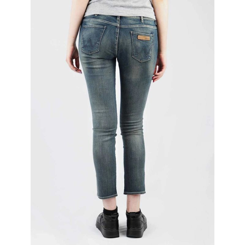 Dámské džínové kalhoty značky wrangler regular střihu se zúženými nohavicemi. zapínání na zip a kovový knoflík s logem. vyrobeno z 98 % bavlny a 2 % elastanu mírně elastické s přídavkem streče. kožená nášivka na zadní kapse s vyraženým logem výrobce.