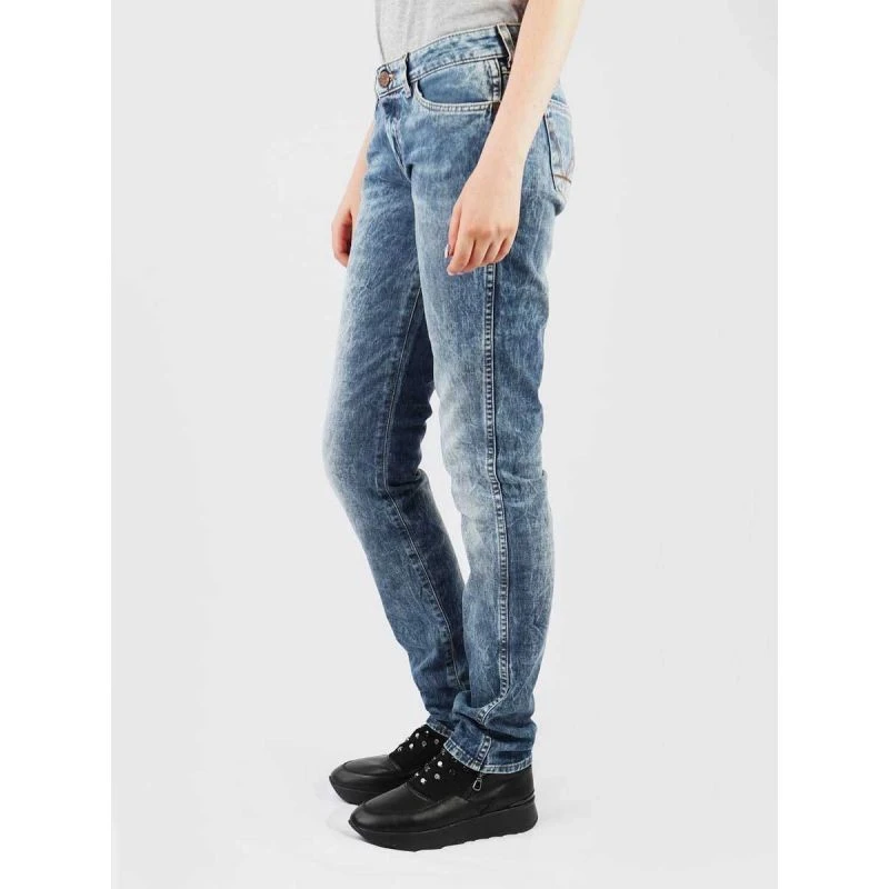 Dámské džínové kalhoty s nízkým sedem, rovnými nohavicemi, zapínáním na zip a koženou nášivkou s logem výrobce na zadní kapse.