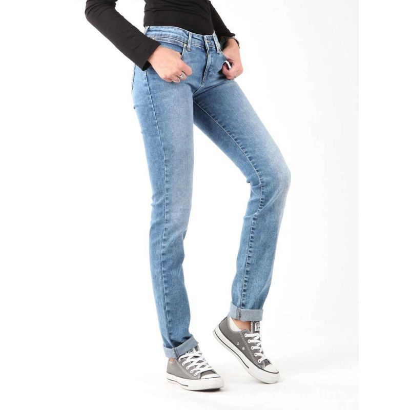 Dámské džíny se zúženými nohavicemi, malými kapsami vpředu a vzadu a koženou vsadkou s logem Wrangler na zadním pásu.