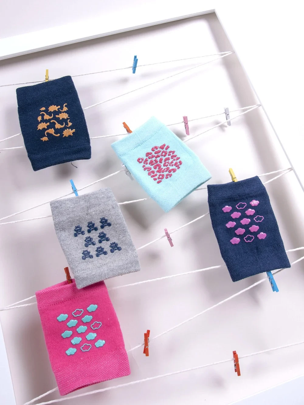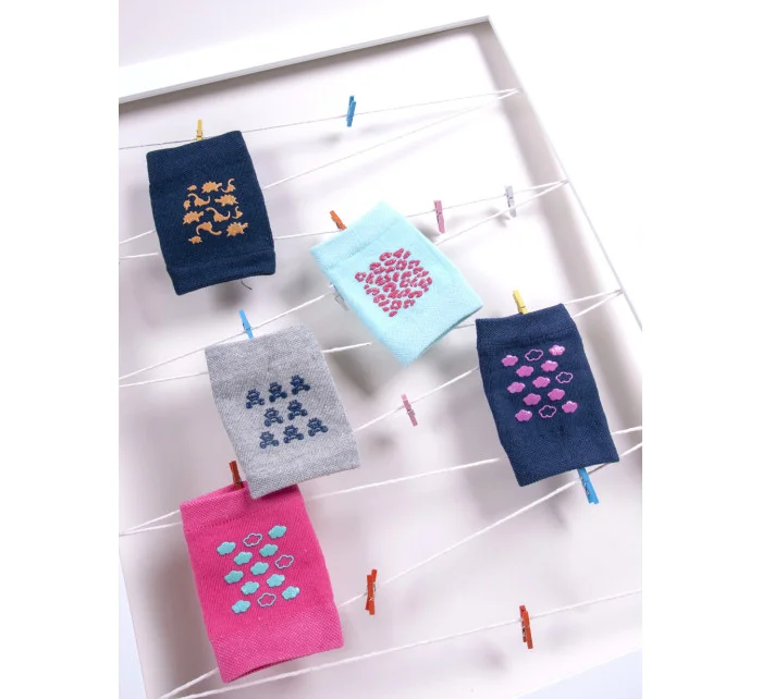Stopki z wysokiej jakości bawełny, ozdobione buźkami zwierzaków, ściągacz komfortowy. Stopa z silikonowym ABS. Dostępne kolory: (kolor przy palcach): żółty, musztardowy, morski, niebieski, granatowy, jeans.