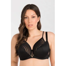 Elegancki biustonosz w klasycznej czerni, który zachwyca detalem. Miseczki zdobią półprzezroczyste wstawki w geometryczne paski, nadające całości lekkości i nowoczesnego charakteru. Konstrukcja została zaprojektowana tak, by zapewniać stabilne podtrzymanie i ładnie modelować biust, a jednocześnie wyglądać niezwykle kobieco. Szerzej poprowadzone ramiączka poprawiają komfort noszenia, a gładkie wykończenia sprawiają, że biustonosz świetnie układa się pod ubraniem. Idealny wybór na co dzień, kiedy chcesz czuć się wygodnie, ale też wyjątkowo.