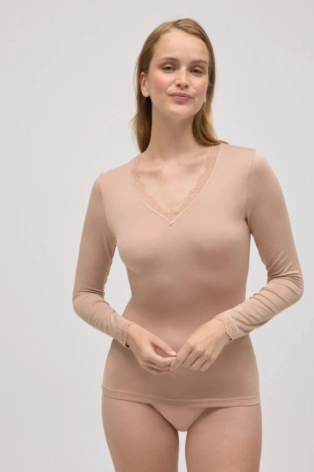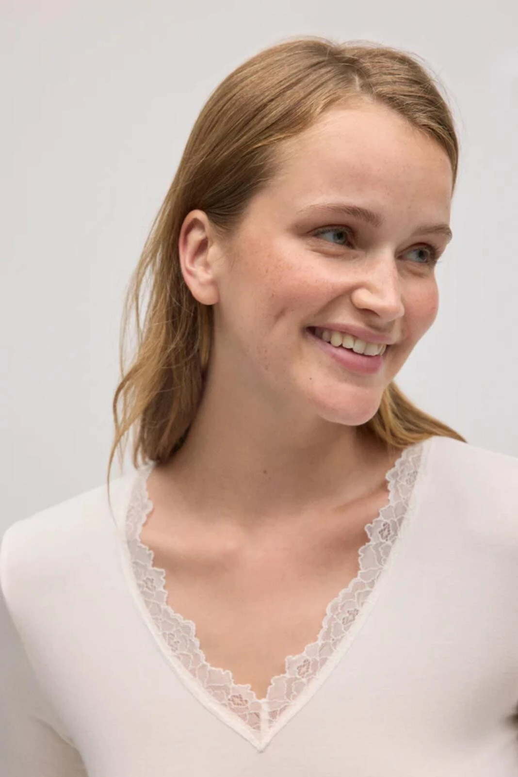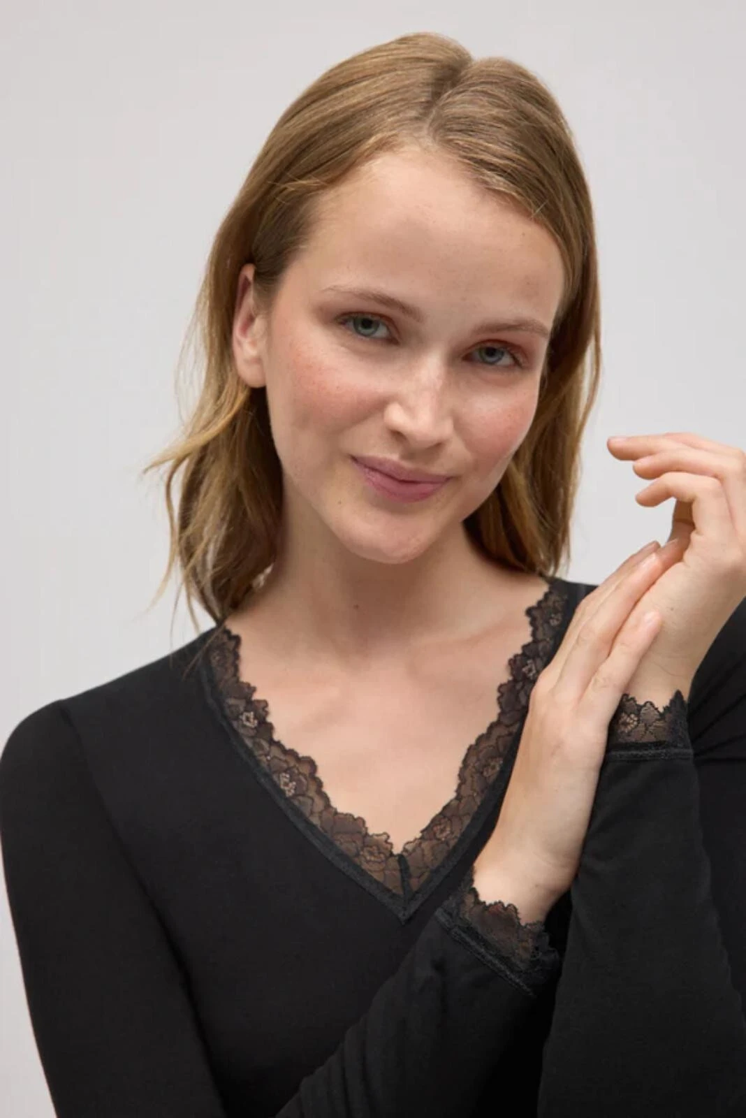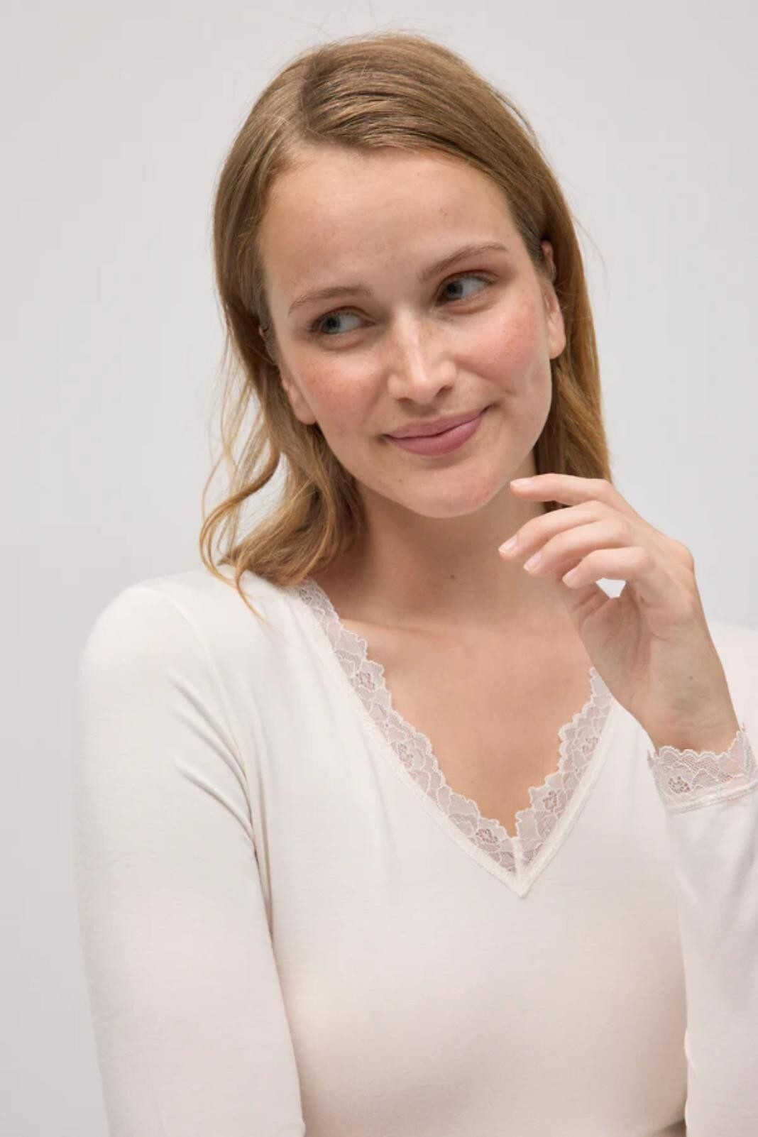 - výstřih a manžety zakončené jemnou krajkou