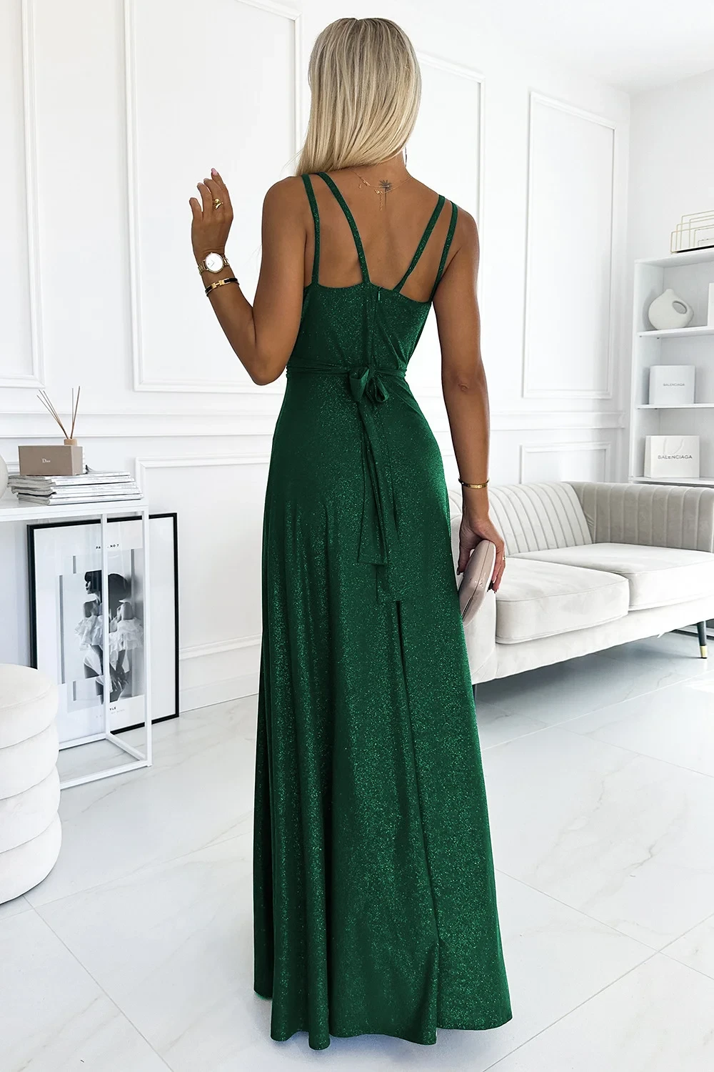 Długa błyszcząca suknia maxi z kopertowym dekoltem, podwójnymi ramiączkami i rozcięciem na nogę. Kolor: zielony z brokatem. Sukienka pięknie eksponuje dekolt i świetnie układa się w tańcu. Zapinana z tyłu na kryty zamek. Produkt polski. Marka numoco.