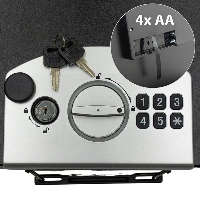 Sejf wyposażony jest w elektroniczny zamek szyfrowy, który pozwala na ustawienie indywidualnego kodu PIN, zapewniając szybki i wygodny dostęp do zawartości. Zamek działa na baterie, a w przypadku ich wyczerpania dostęp można uzyskać za pomocą klucza awaryjnego, co gwarantuje bezpieczeństwo nawet w sytuacjach awaryjnych.