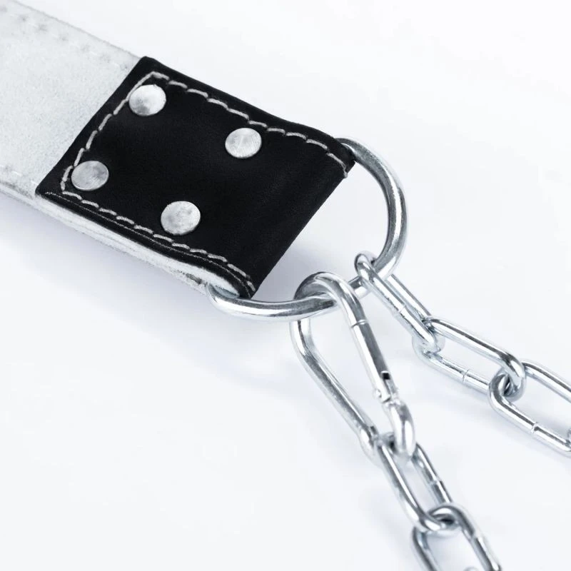 Klamry do mocowania łańcucha zostały wzmocnione 4 wytrzymałymi nitami, które zapewniają pełne bezpieczeństwo podczas intensywnych treningów. Dzięki temu pas charakteryzuje się wyjątkową wytrzymałością na obciążenia, co gwarantuje jego niezawodność nawet w najcięższych warunkach.