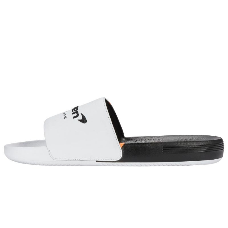 - Sportovní design - černobílé barevné provedení s akcenty v odstínu papáji je inspirováno estetikou značky McLaren a dodává žabkám dynamický nádech.