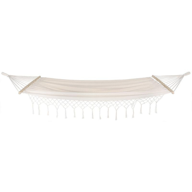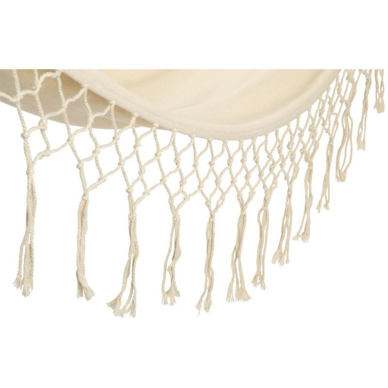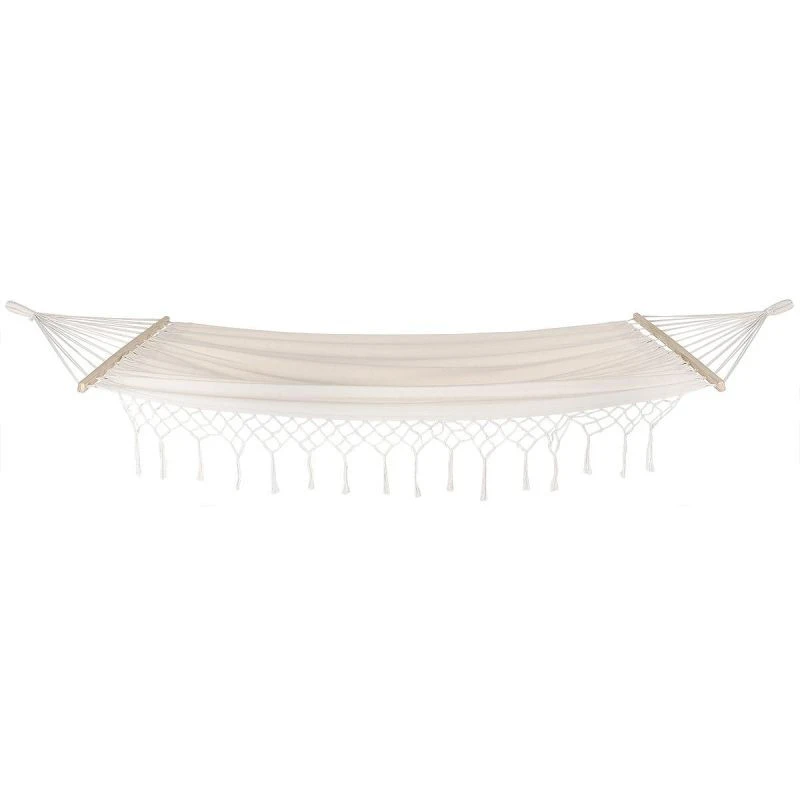 Nasz HAMAK OGRODOWY 1 OSOBOWY 200X100CM Z DRĄŻKIEM I Z FRĘDZLAMI MIAMI ECRU to doskonały wybór na leniwe, letnie popołudnie w ogrodzie. Wysokiej jakości materiał i solidna konstrukcja, o nośności aż 120 kg zapewnią Ci bezpieczeństwo oraz niezwykłą wygodę. Jest bardzo lekki, dzięki czemu możesz go ze sobą zabrać praktycznie wszędzie. Wykonany z naturalnej bawełny, jest bardzo wytrzymały i przewiewny, dzięki czemu będzie z Ci zapewniał słodkie lenistwo przez wiele lat. Wypoczywaj na całego na wygodnym i stabilnym hamaku. Zamień kawałek trawy w oazę ciszy i spokoju, bo tym hamakiem, relaks na świeżym powietrzu to czysta przyjemność! Nie masz go gdzie zawiesić? To żaden problem w naszym sklepie internetowym możesz dokupić równie wytrzymały stelaż do hamaków lub każdego rodzaju uchwyty do jego montażu. Nie zwlekaj, każdemu należy się chwila zapomnienia!