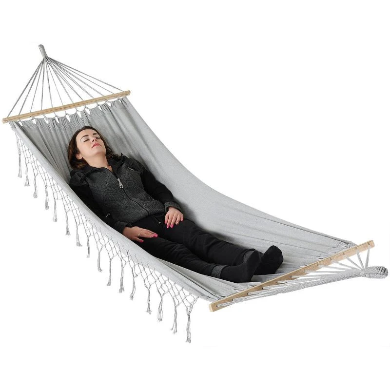 Nasz HAMAK OGRODOWY 1 OSOBOWY 200X100CM Z DRĄŻKIEM I Z FRĘDZLAMI MIAMI SZARY to doskonały wybór na leniwe, letnie popołudnie w ogrodzie. Wysokiej jakości materiał i solidna konstrukcja, o nośności aż 120 kg zapewnią Ci bezpieczeństwo oraz niezwykłą wygodę. Jest bardzo lekki, dzięki czemu możesz go ze sobą zabrać praktycznie wszędzie. Wykonany z naturalnej bawełny jest bardzo wytrzymały i przewiewny, dzięki czemu będzie z Ci zapewniał słodkie lenistwo przez wiele lat. Wypoczywaj na całego na wygodnym i stabilnym hamaku. Zamień kawałek trawy w oazę ciszy i spokoju, bo tym hamakiem, relaks na świeżym powietrzu to czysta przyjemność! Nie masz go gdzie zawiesić? To żaden problem w naszym sklepie internetowym możesz dokupić równie wytrzymały stelaż do hamaków lub każdego rodzaju uchwyty do jego montażu. Nie zwlekaj, każdemu należy się chwila zapomnienia!