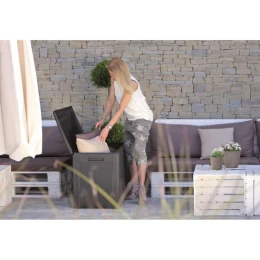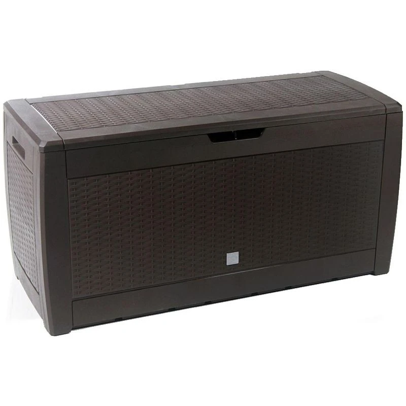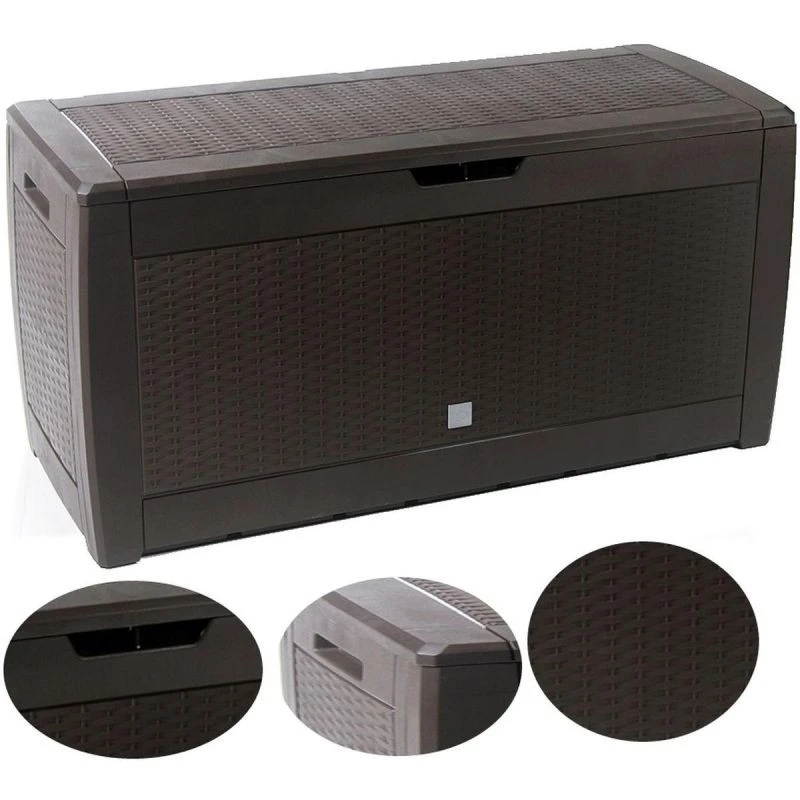 Box RATIO PLUS s elegantní povrchovou úpravou imitující ratan je ideální pro uložení polštářů, přikrývek, nářadí, zahradních hraček nebo jiných předmětů a chrání je před prachem nebo deštěm.