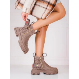 Zajímavé dámské kotníčkové boty hnědé na plochém podpatku