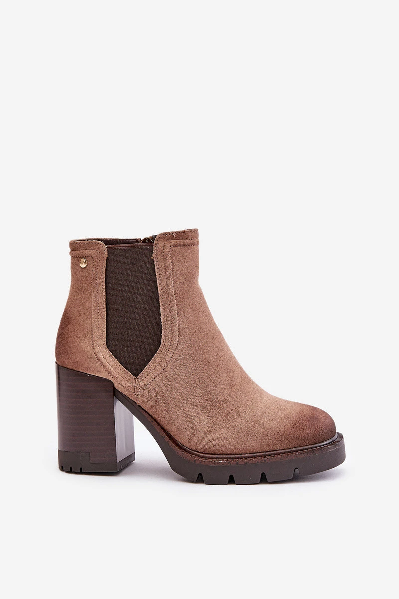 Zateplené dámské botky na podpatku z eko semiše béžové model 21675622 - VINCEZA