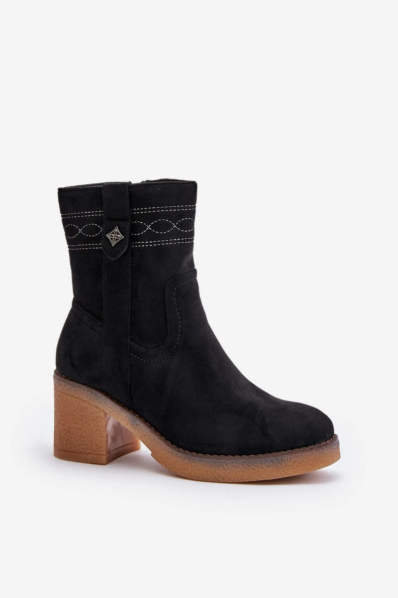 Klasické dámské boty vyrobené z eko semiše. Umístěné na podpatku ve tvaru sloupu. Špičky jsou zaoblené. Tento model se vyznačuje prošíváním na svršku a malým detailem. Vnitřek je zateplen měkkým obuvnickým rounem, ideální na chladnější dny. Při výběru velikosti se řiďte tabulkou velikostí.