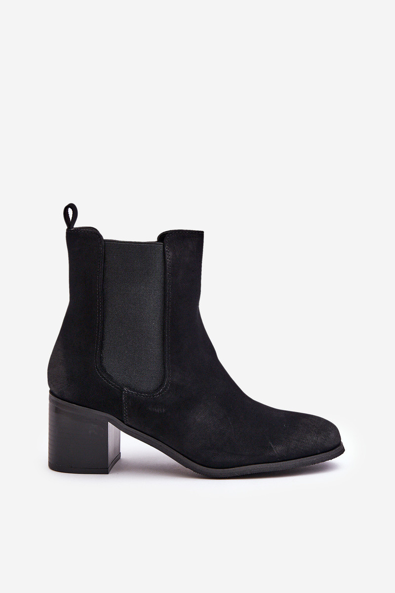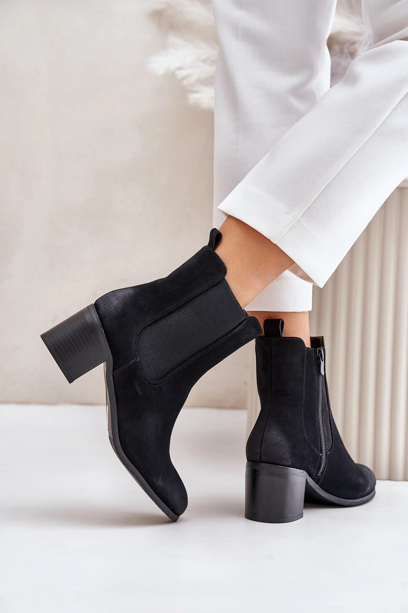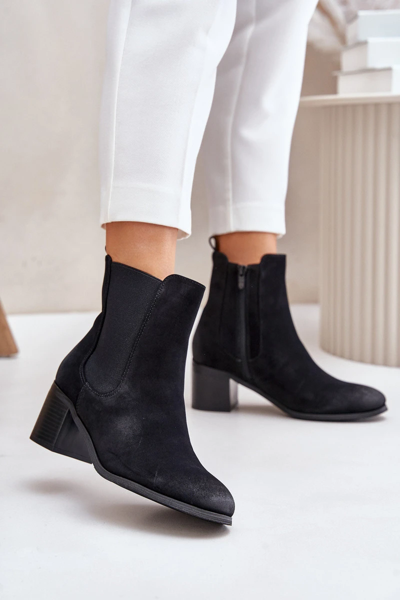 Dámské kotníkové boty z eko semiše. Vyznačují se podpatkem ve tvaru sloupku a zaoblenými špičkami. Zpevněná pata zajišťuje stabilitu a pohodlí při nošení. Na svršku elastická vložka. Vnitřek zateplený obuvnickou látkou. Tyto boty budou ideálním doplňkem podzimních outfitů!