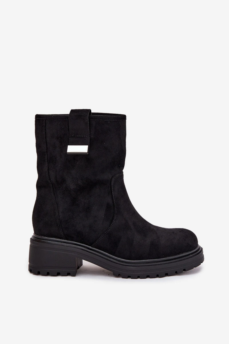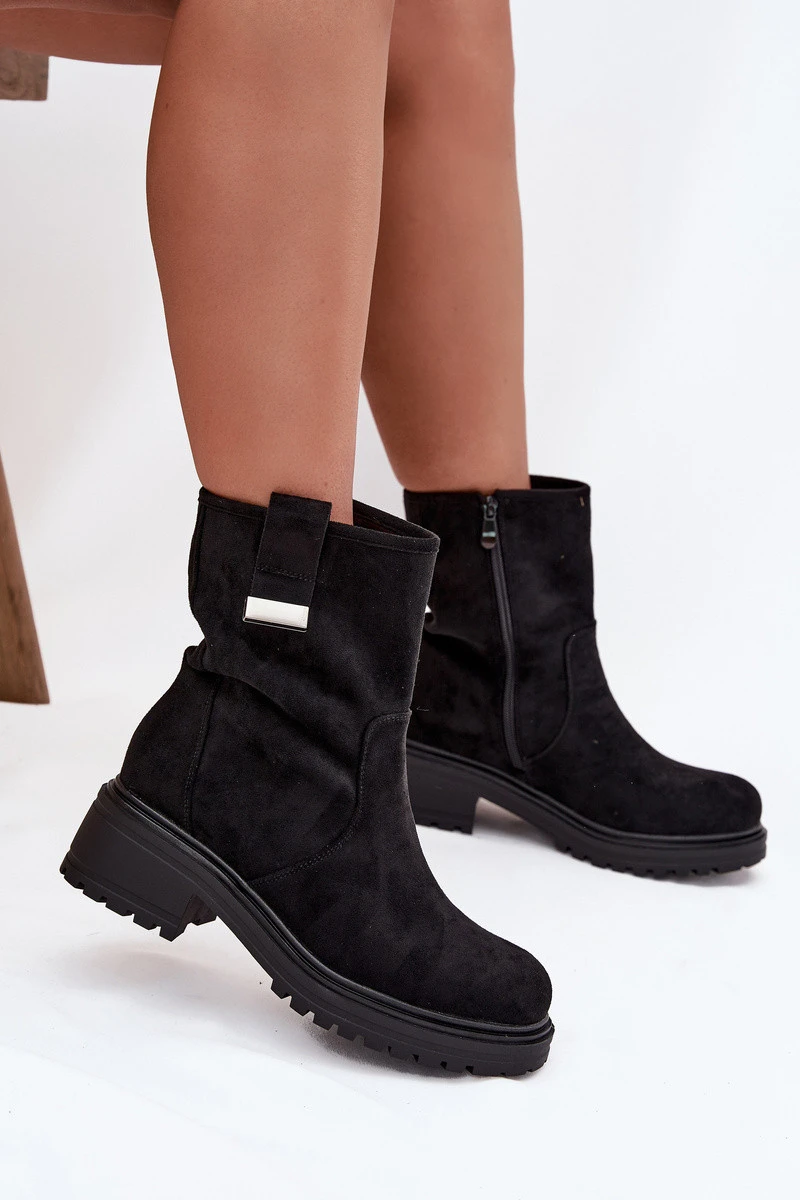 Dámské kotníkové boty vyrobené z eko semiše. Postavené na nízkém podpatku, zajišťují pohodlí při každém kroku, a vnitřek vyhřívaný dekou na obuv zajišťuje teplo. Model na zip usnadňuje rychlé obouvání a ozdobný krátký pásek nahoře na límci dodává jemný, stylový akcent, který podtrhuje každodenní stylizace. Při výběru velikosti se prosím řiďte tabulkou velikostí. Při výběru velikosti se řiďte tabulkou velikostí.
