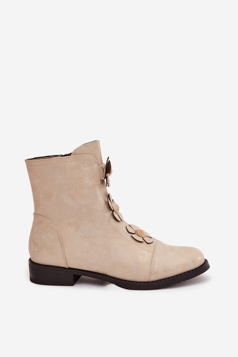 Zateplené dámské kotníkové boty na nízkém podpatku s ozdobnými květinami zlaté model 21711109 - Boto