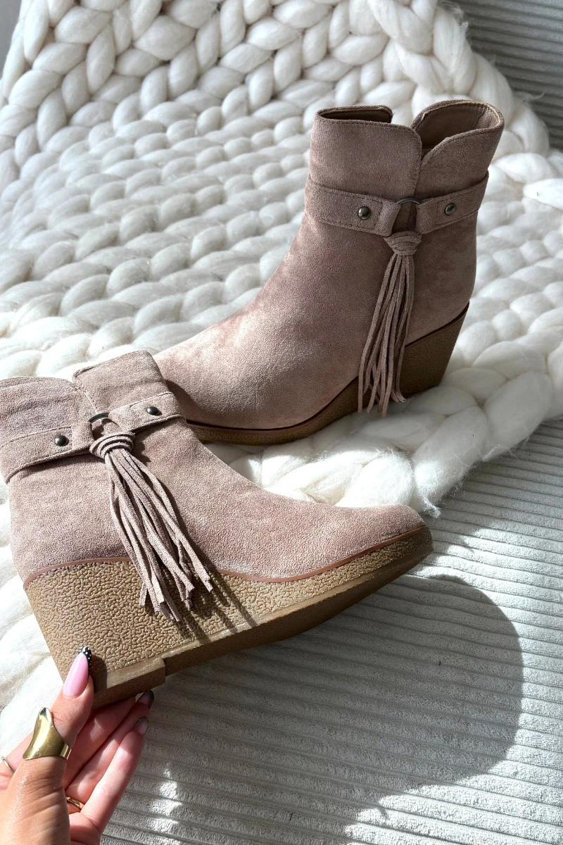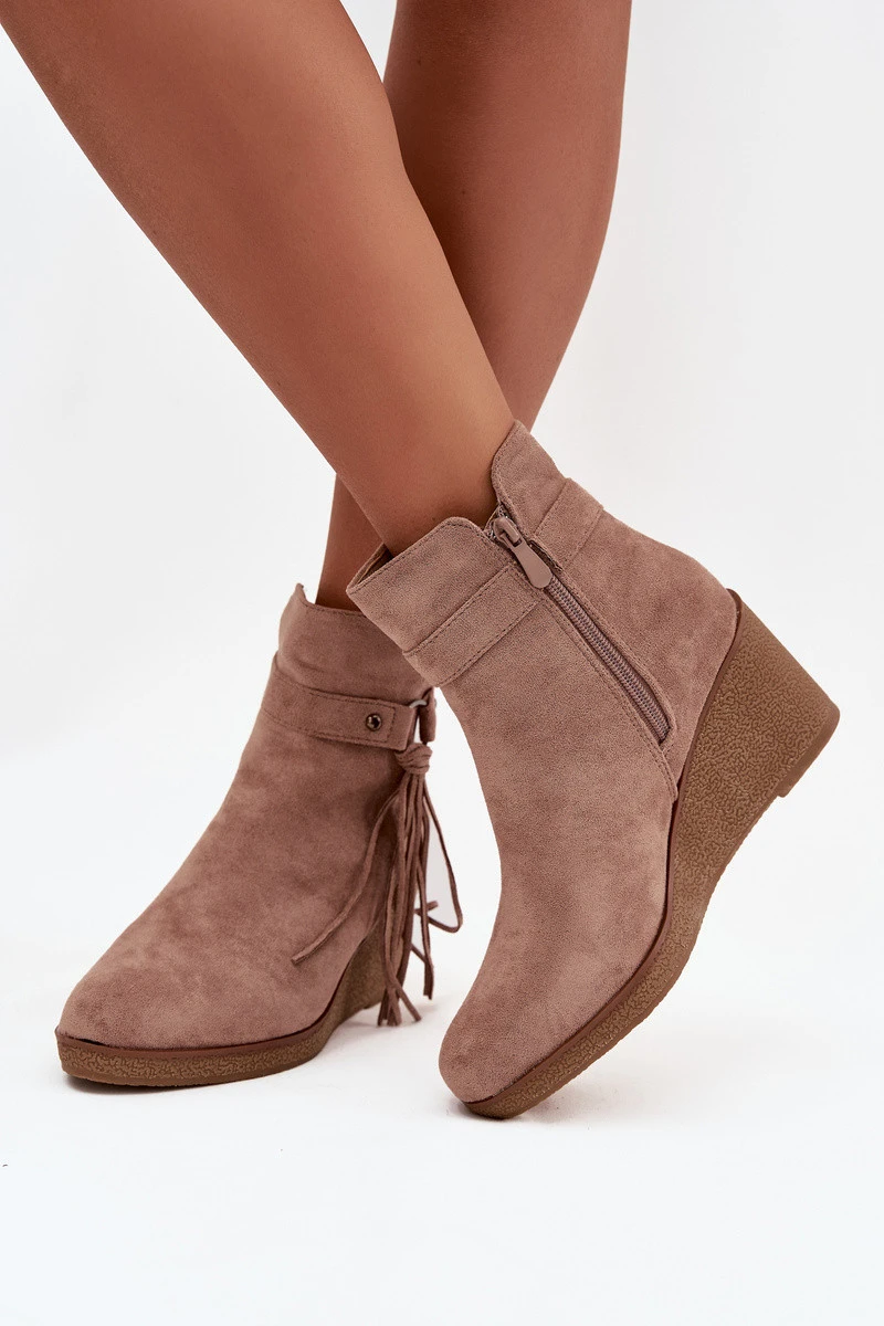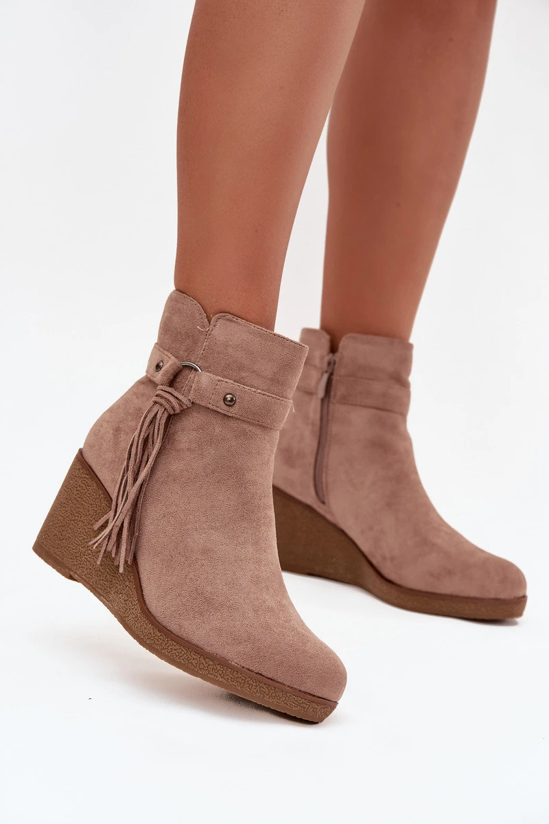 Zateplené dámské kotníkové boty na platformě s třásněmi béžové model 21711536 - Boto