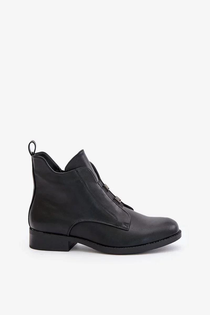 Dámské kotníkové boty vyrobené z eko kůže jsou kombinací stylu a pohodlí, ideální na chladnější dny. Zabudované na plochém podpatku, zaručují pohodlí při nošení. Model má zaoblené špičky a dvě jemné ozdoby vpředu, které dodávají elegantní charakter. Zapínání na zip usnadňuje obouvání a vnitřek zateplený obuvnickou dekou zajišťuje teplo a pohodlí. Ideální pro každodenní stylizace. Při výběru velikosti se prosím řiďte tabulkou velikostí.
