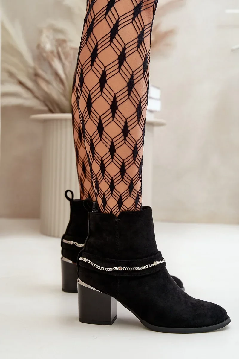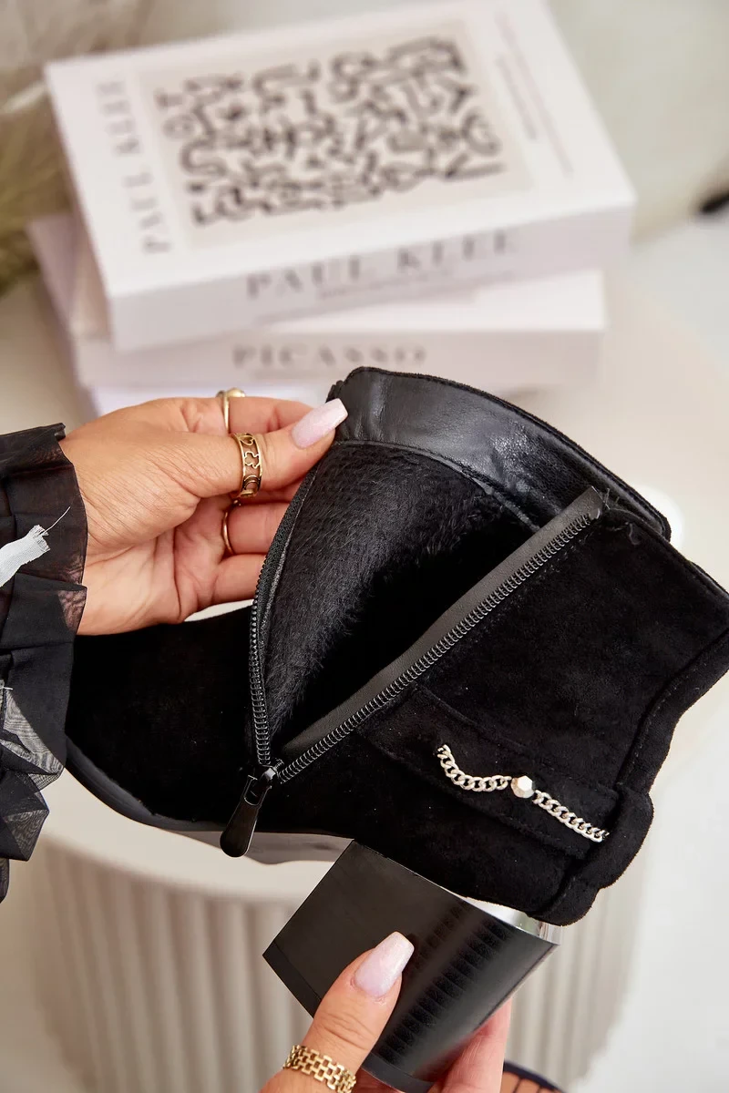 Zateplené Dámské Kotníkové Boty Na Podpatku S Řetízkem Eko Semišové Černé Hanalen