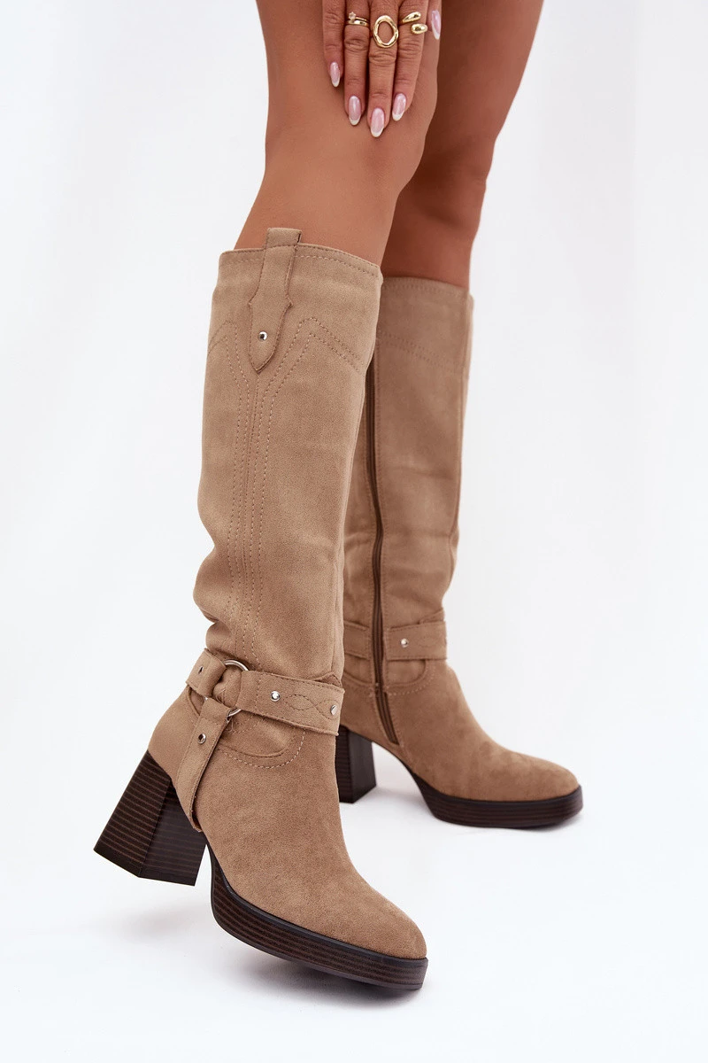Dámské kozačky vyrobené z eko semiše. Umístěny na sloupkovém podpatku. Zapínání na zip zajišťuje snadné obouvání a zateplení obuvnickou kožešinou zaručuje teplo v chladnějších dnech. Svršek sahající až ke kolenům je ozdoben jemným prvkem s pásky a švy, které botám dodávají charakter. Tyto kozačky budou skvělou volbou pro elegantní i každodenní stylizace, zajišťující komfort a módní vzhled. Při výběru velikosti se řiďte tabulkou velikostí.