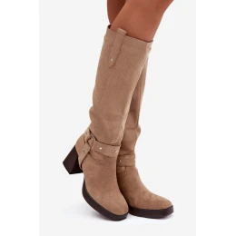 Dámské kozačky vyrobené z eko semiše. Umístěny na sloupkovém podpatku. Zapínání na zip zajišťuje snadné obouvání a zateplení obuvnickou kožešinou zaručuje teplo v chladnějších dnech. Svršek sahající až ke kolenům je ozdoben jemným prvkem s pásky a švy, které botám dodávají charakter. Tyto kozačky budou skvělou volbou pro elegantní i každodenní stylizace, zajišťující komfort a módní vzhled. Při výběru velikosti se řiďte tabulkou velikostí.