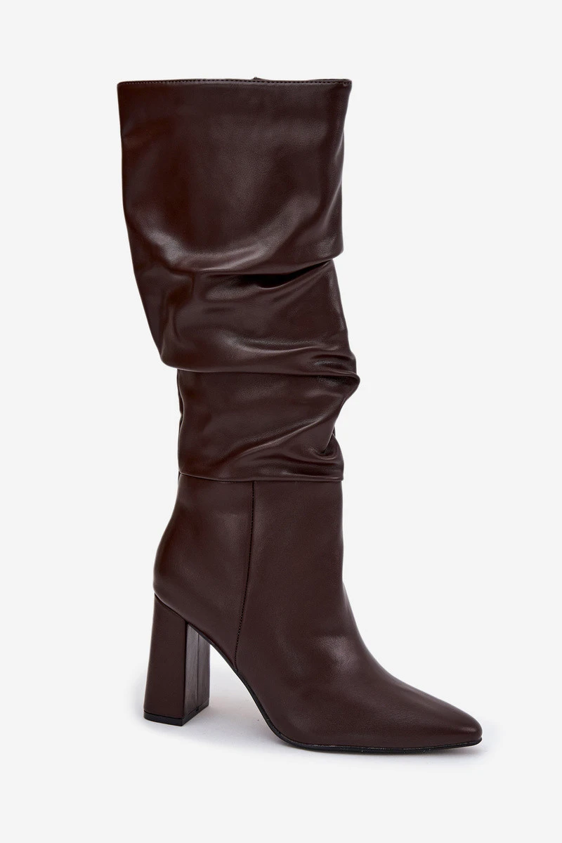 Dámské kozačky vyrobené z eko kůže. Stabilní podpatky typu sloupka zajišťují pohodlí při chůzi, a mandlové špičky dodávají klasický charakter. Vršek s řasením poskytuje módní a originální vzhled, díky čemuž se skvěle vyjímají v outfitu. Kozačky jsou zapínací na praktický zip, což usnadňuje jejich obouvání a sundávání. Ideální jak k nohavicím, tak k šatům – hodí se do mnoha každodenních i elegantních outfitů. Při výběru velikosti se řiďte tabulkou velikostí. Při výběru velikosti se řiďte tabulkou velikostí.