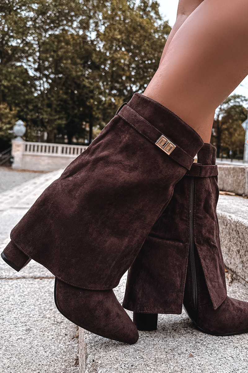 Zateplené dámské kozačky na podpatku s ozdobným páskem čokoládové Luvielle