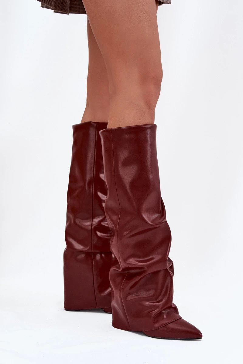 Zateplené dámské kozačky s lemem na podpatku bordó model 21707797 - Boto