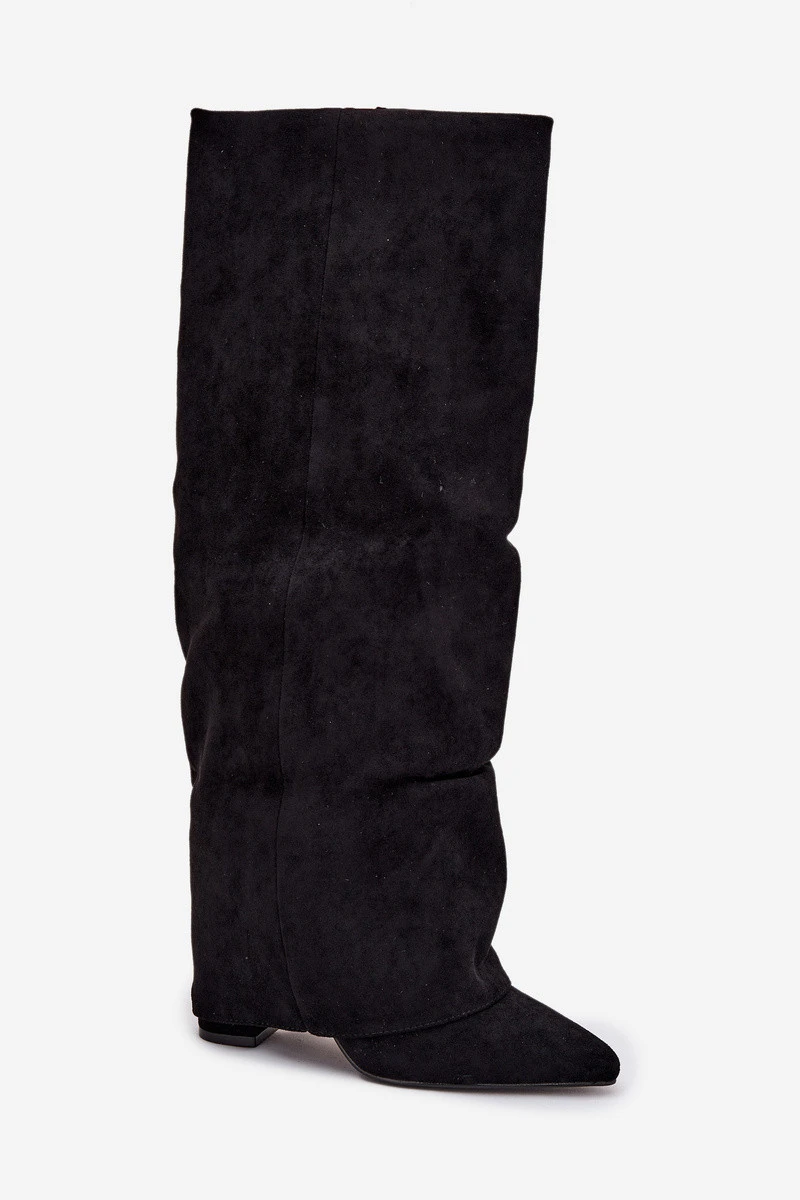 Zateplené dámské kozačky s lemem na podpatku ekologické semišové černé model 21707825 - Boto