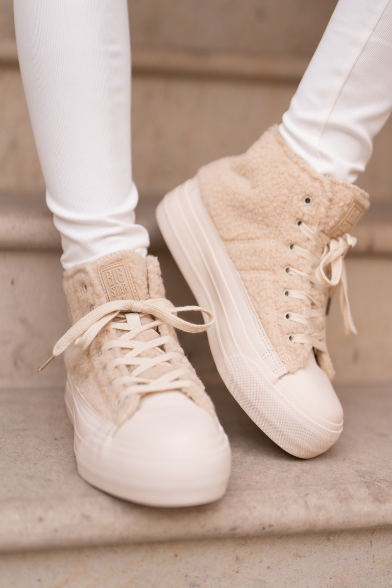 Dámské tenisky značky BIG STAR. Vyrobené z módního beránkového kožíšku. Uvnitř zateplené obuvnickou dekou, což zaručuje teplo v chladnějších dnech. Uloženy na platformě, která skvěle izoluje od studené země. Kulaté špičky. Tento stylový kousek bys měla mít ve své podzimní a zimní garderobě. Při výběru velikosti se řiďte tabulkou velikostí.