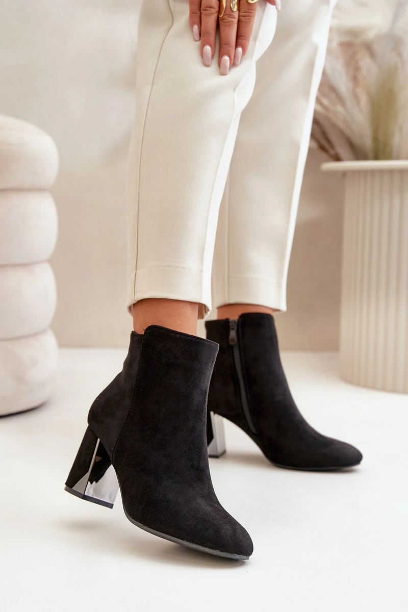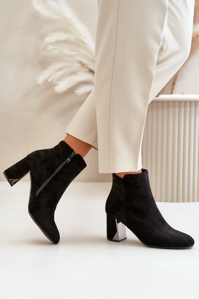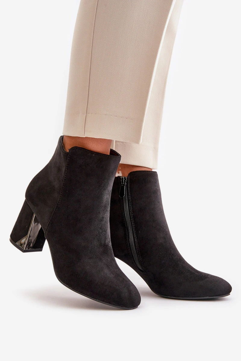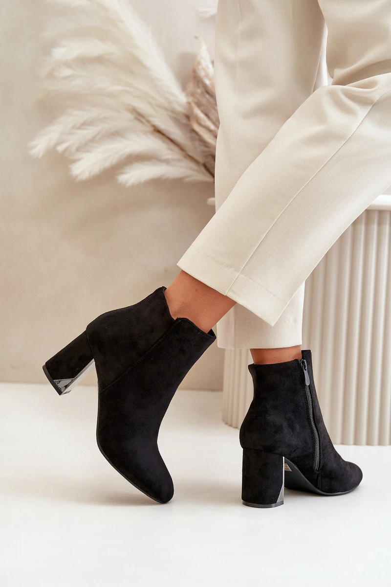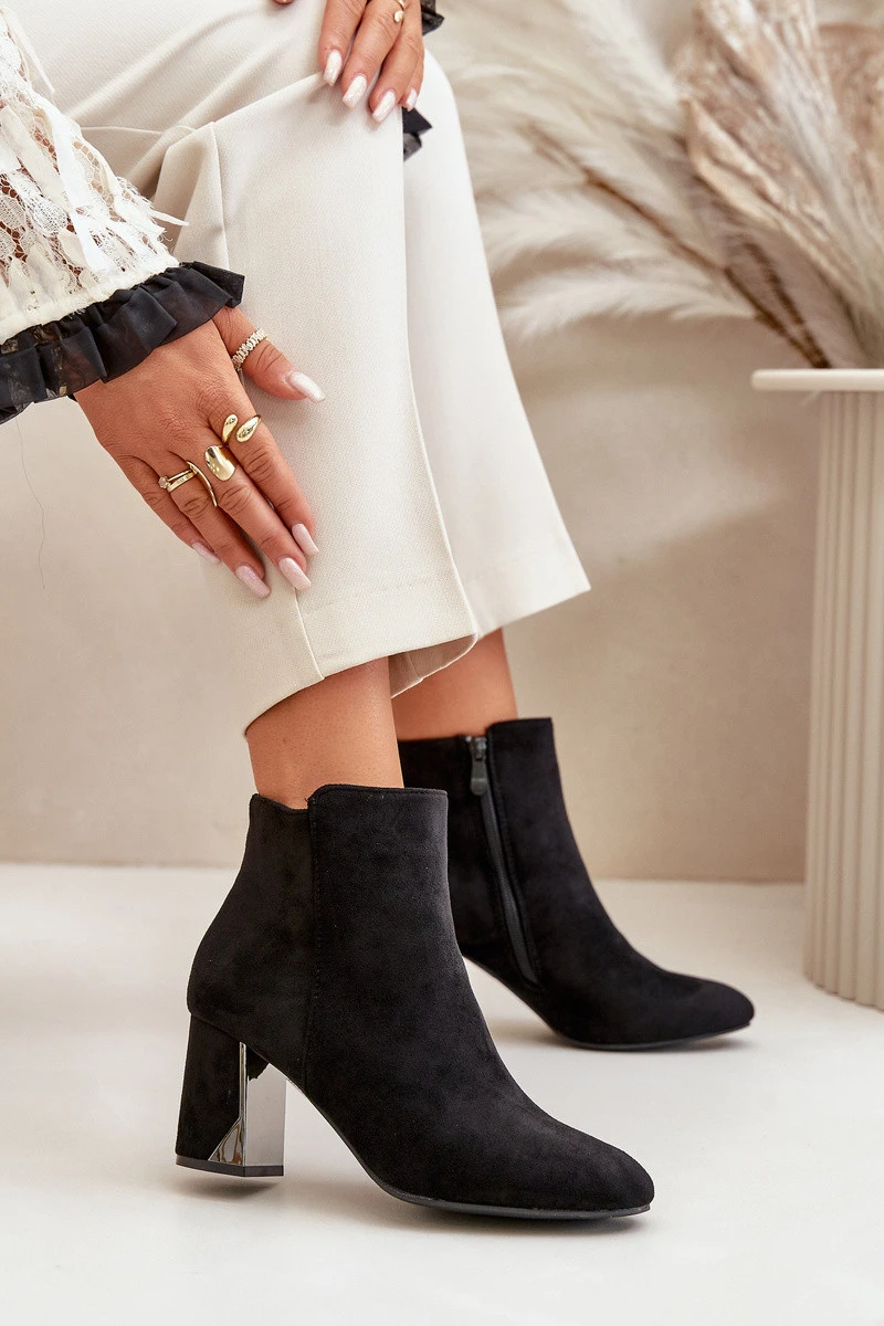 Elegantní boty z eko semiše, usazené na sloupkovém podpatku, se vyznačují špičatými špičkami, které jim dodávají šmrnc. Vnitřek je zateplený, což zajišťuje komfort v chladnějších dnech. Zapínají se na zip na boku, navíc ozdobené zlatým zipem, což dodává jedinečný styl. Při výběru velikosti se řiďte tabulkou velikostí.