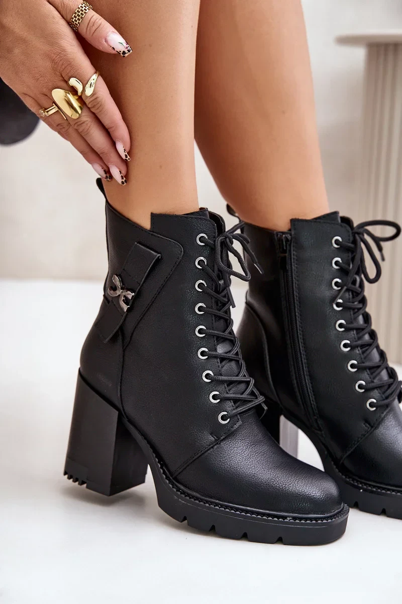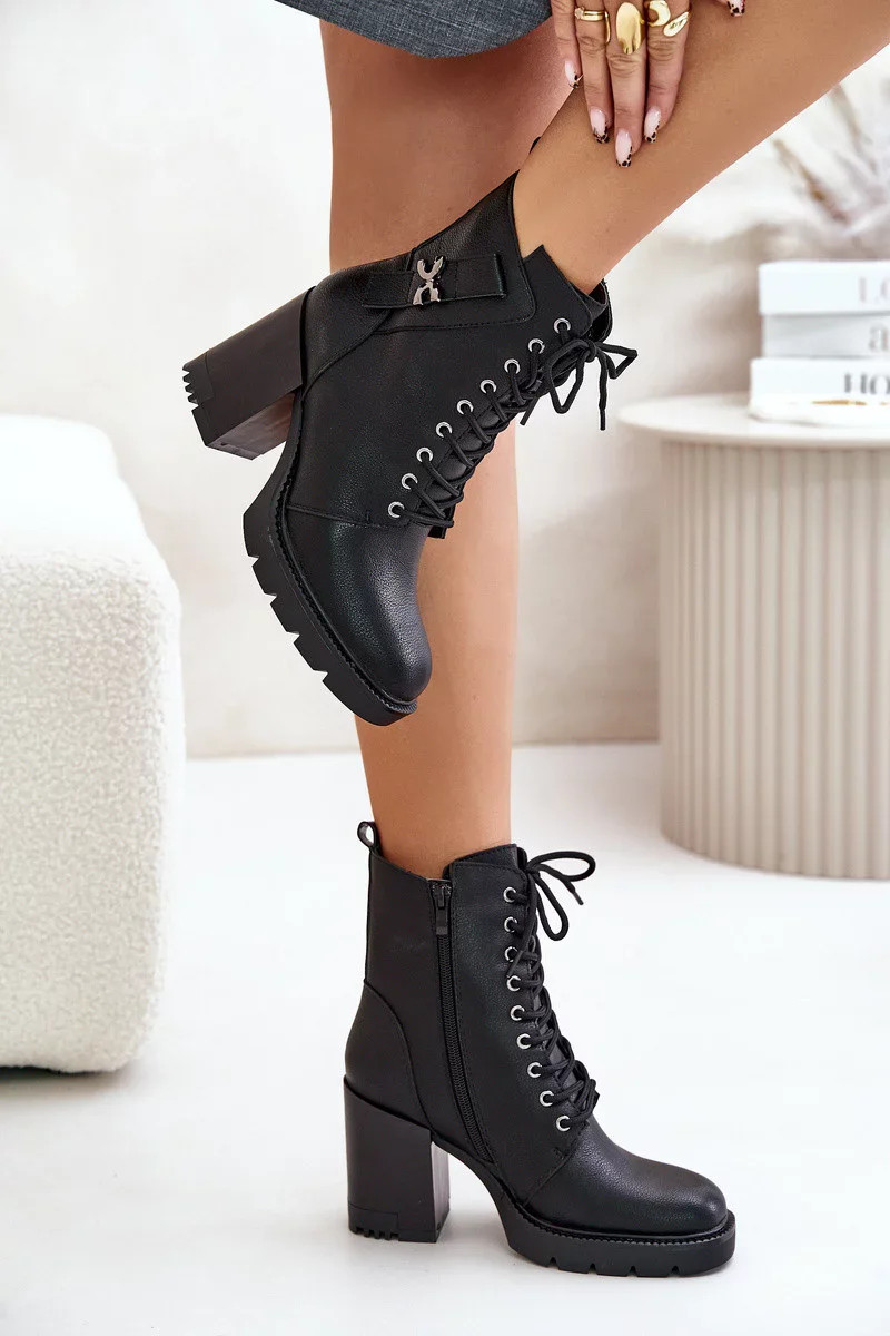 Osazené na stabilním podpatku ve formě sloupku. Model zapínaný na zámek a dodatečně šněrovaný, což zaručuje ideální přizpůsobení. Zateplený interiér zajišťuje pohodlí v chladnějších dnech. Na svršku se nachází stylový pásek ozdobený zlatým detailem, který dodává eleganci a podtrhuje výjimečný charakter. Při výběru velikosti se prosím řiďte tabulkou velikostí.