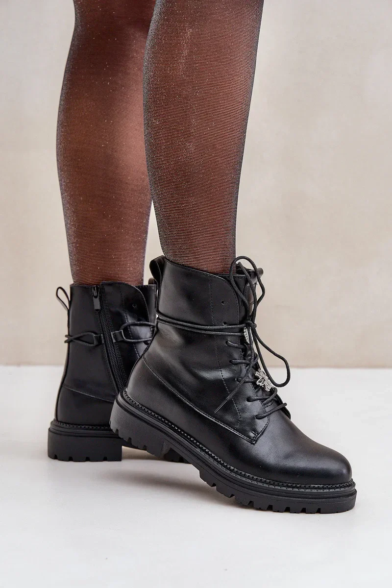 Kotníkové boty z eko kůže na plochém podpatku jsou skvělou volbou pro chladnější dny. Model se vyznačuje zaoblenými špičkami a šněrováním, ozdobeným efektními připínáčky, které dodávají výjimečný půvab. Vnitřek zateplený obuvnickou dekou zajišťuje teplo a pohodlí při nošení. Praktické a módní, ideální pro každodenní stylizace! Při výběru velikosti se prosím řiďte tabulkou velikostí.