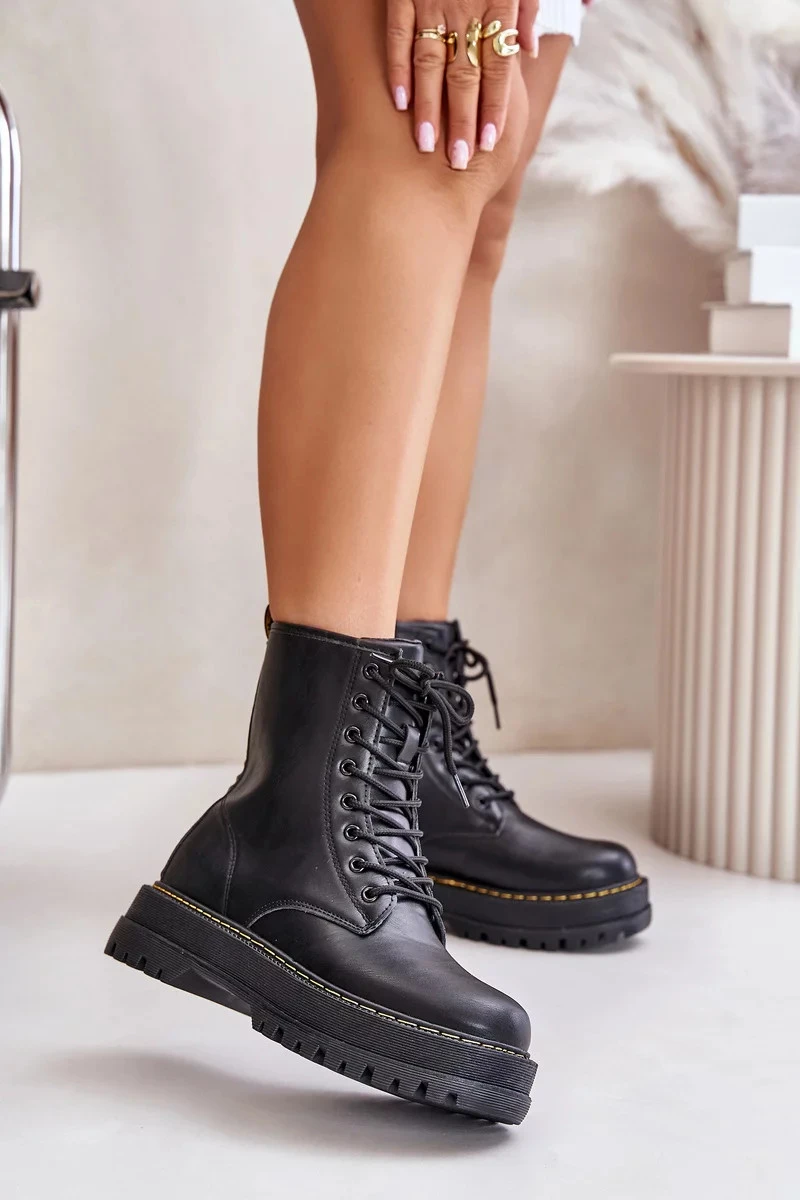 Dámské kotníkové boty vyrobené z eko kůže. Mají zip na boku svršku a šněrování. Vestavěné na platformě. Mají uvnitř zateplení v podobě obuvnické deky. Dodatečně je pata zpevněná. Tyto boty by měly být ve tvé skříni! Při výběru velikosti se prosím řiďte tabulkou velikostí.