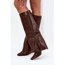 Zateplené Kozačky Na Jehlovém Podpatku S Otočeným Svrškem Čokoládové Tamonia