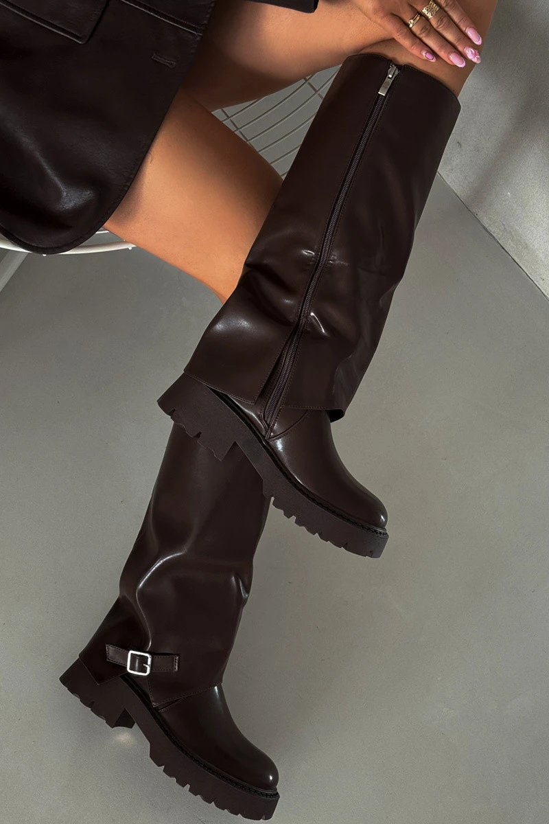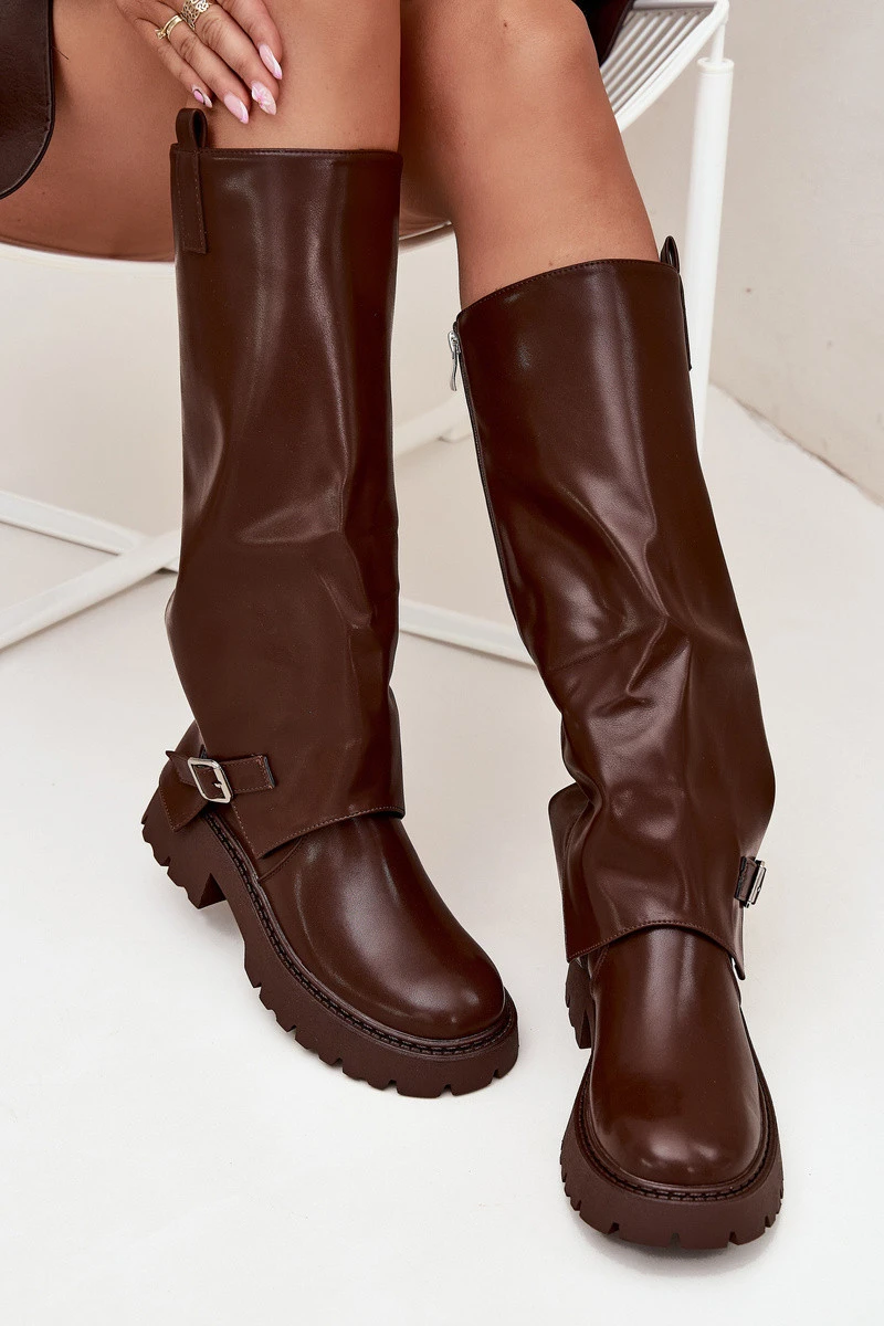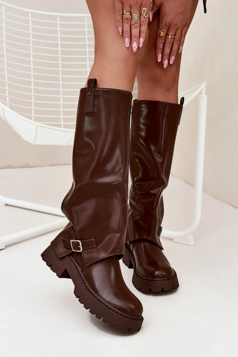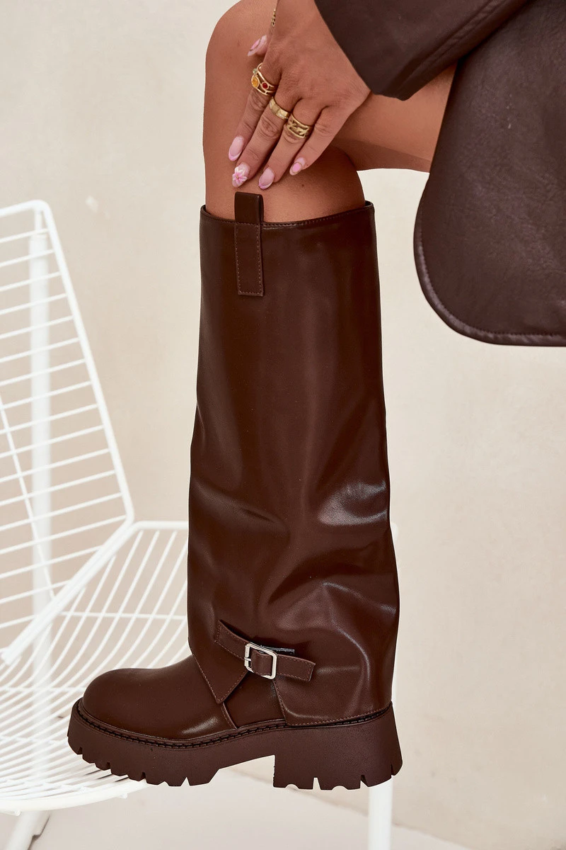 Zateplené kozačky s ohrnutým svrškem a přezkou čokoládové Fiorae