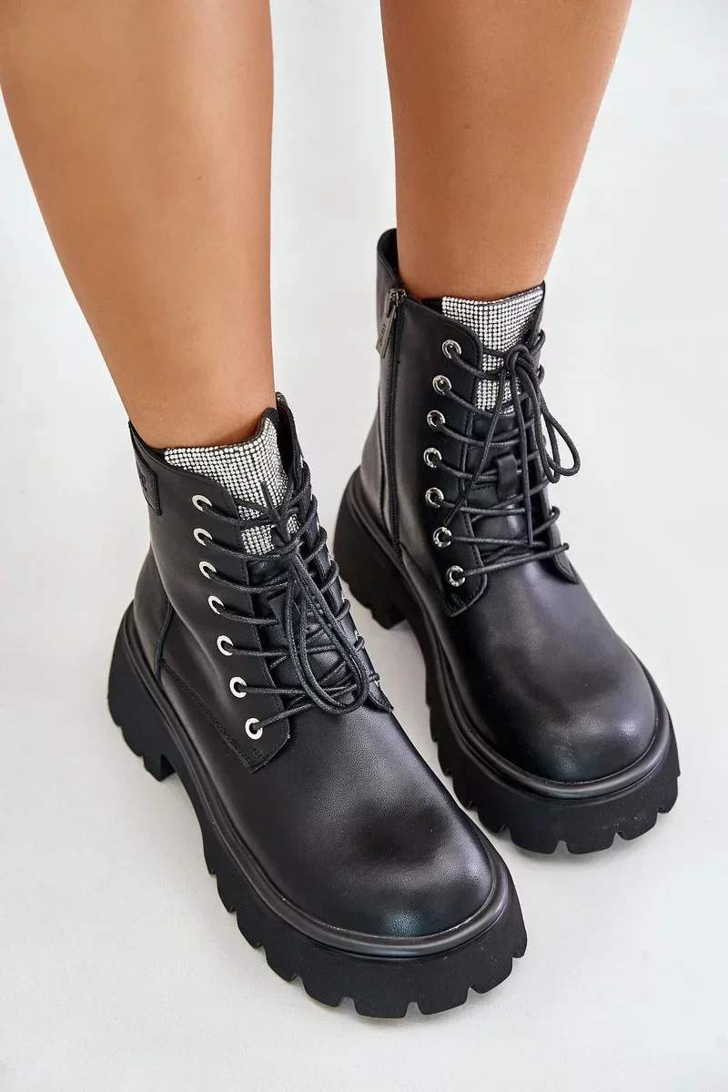 Zateplené Kožené Kotníkové Boty Workery Dámské S Křišťály GOE Černé