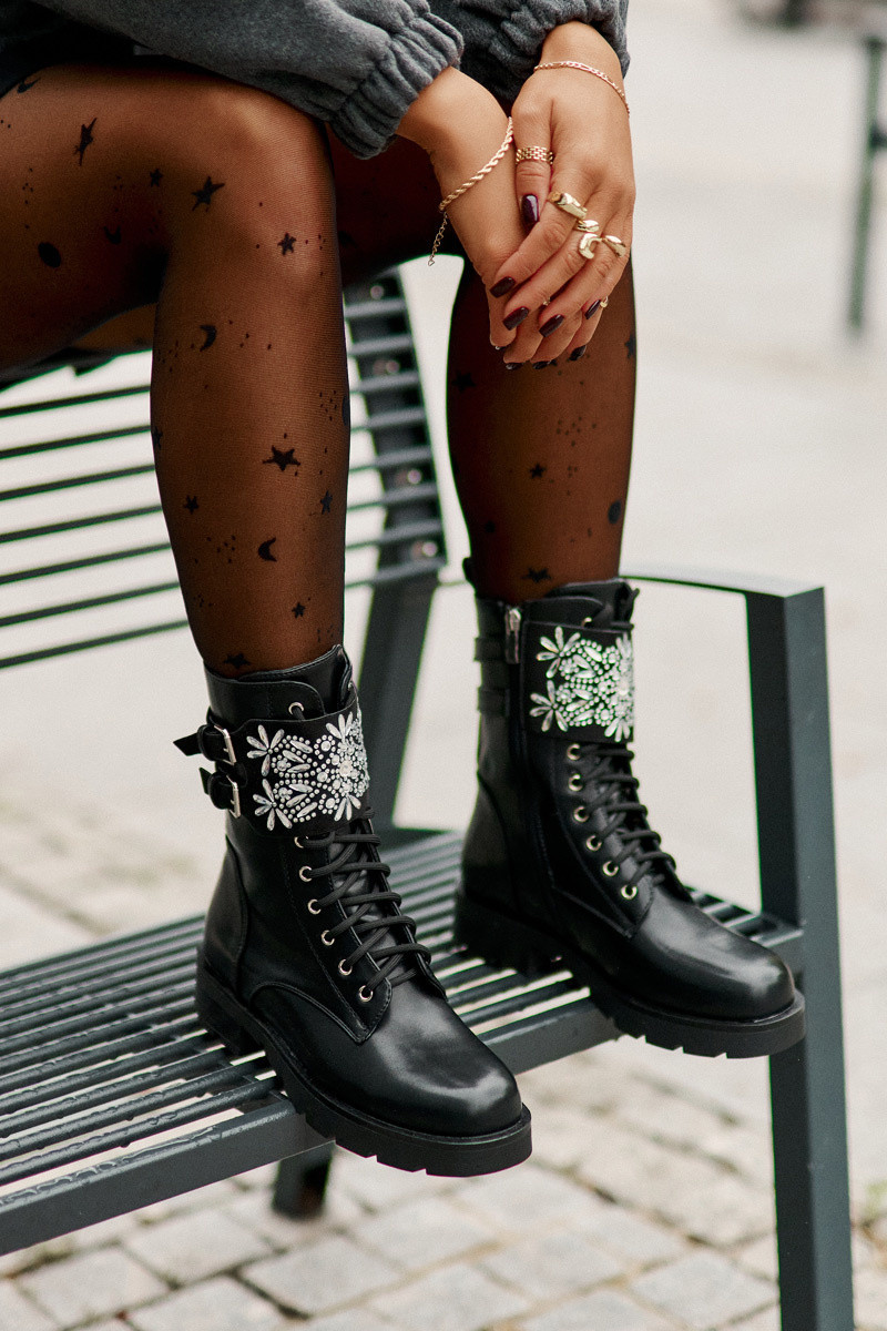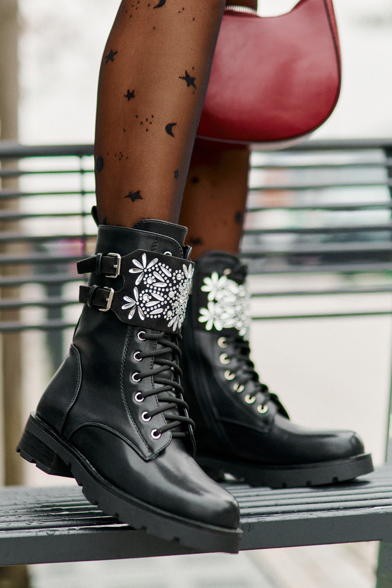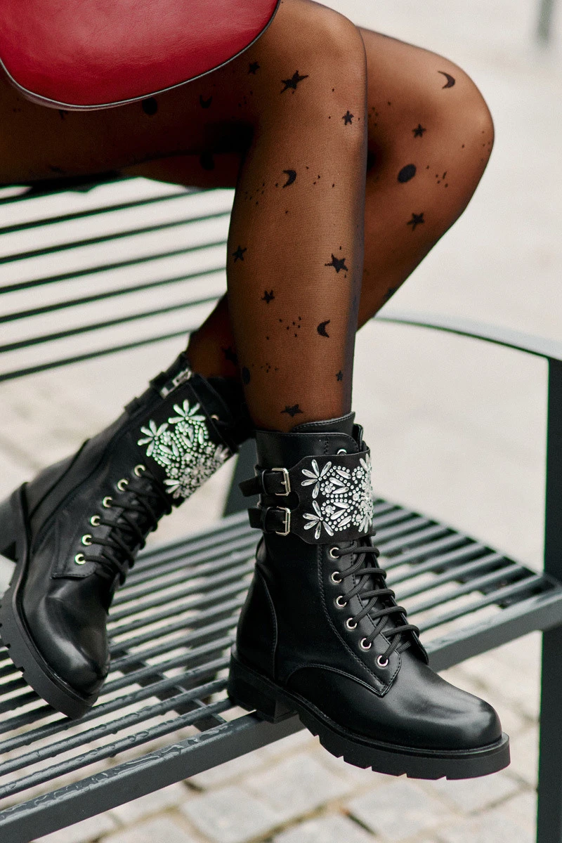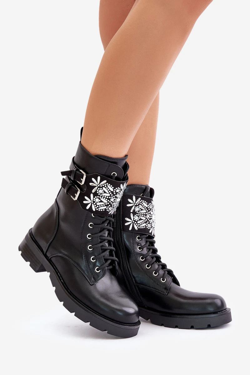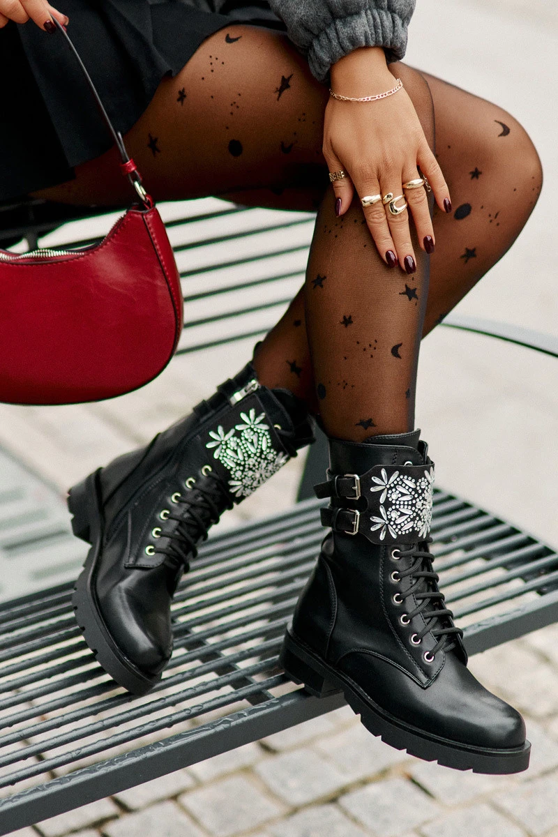 Boty vyrobené z eko kůže jsou stylovou a funkční volbou na chladnější dny. Zateplený interiér zajišťuje teplo a kombinace šněrování a zipu zaručuje pohodlí při obouvání. Model se vyznačuje širokým, zdobeným pásem vpředu s přezkami, což mu dodává výrazný a módní charakter. Ideální pro každodenní styling. Při výběru velikosti se řiďte tabulkou velikostí.