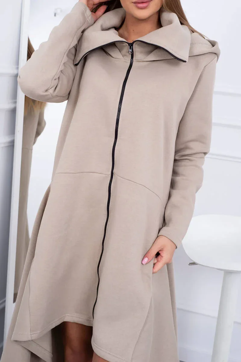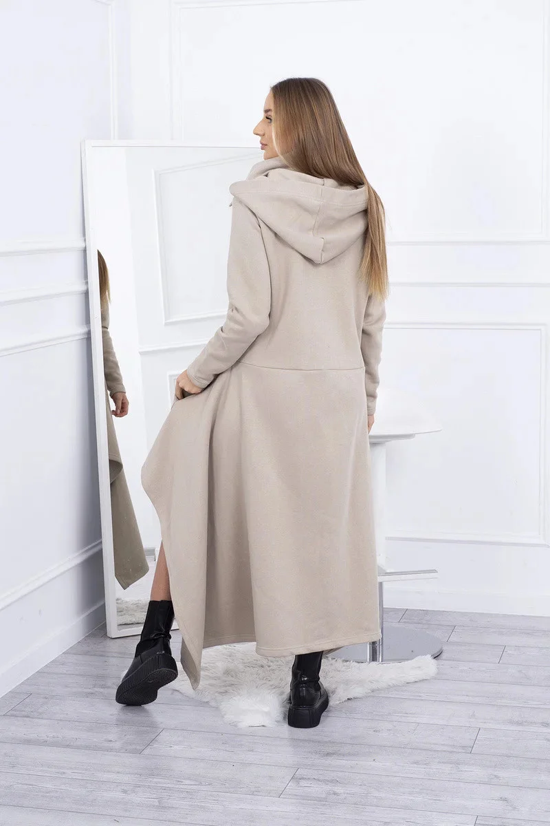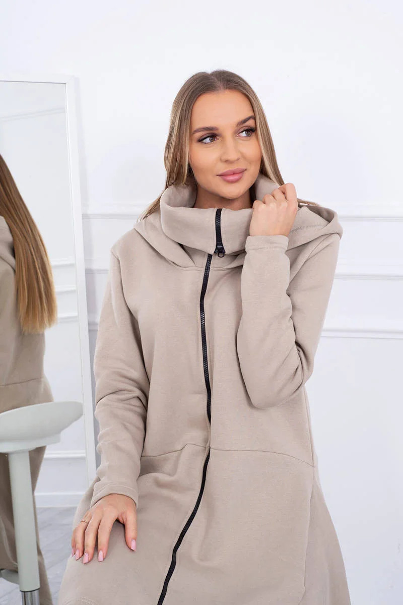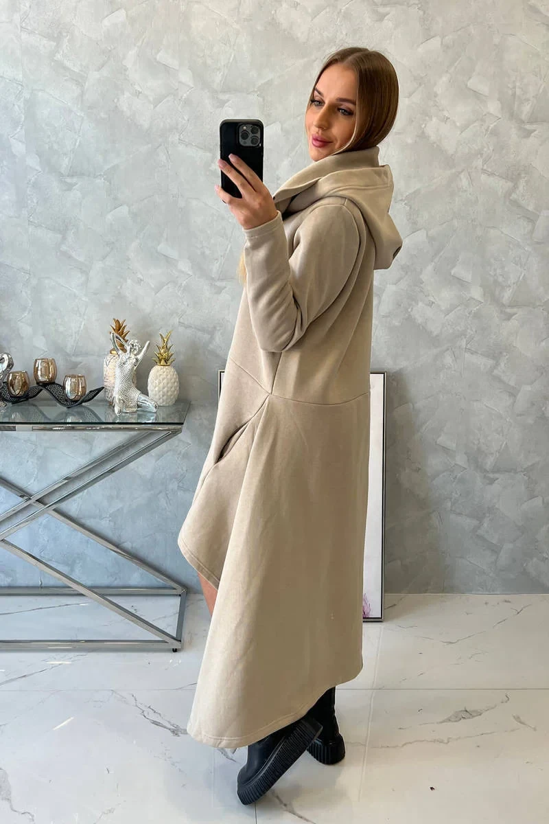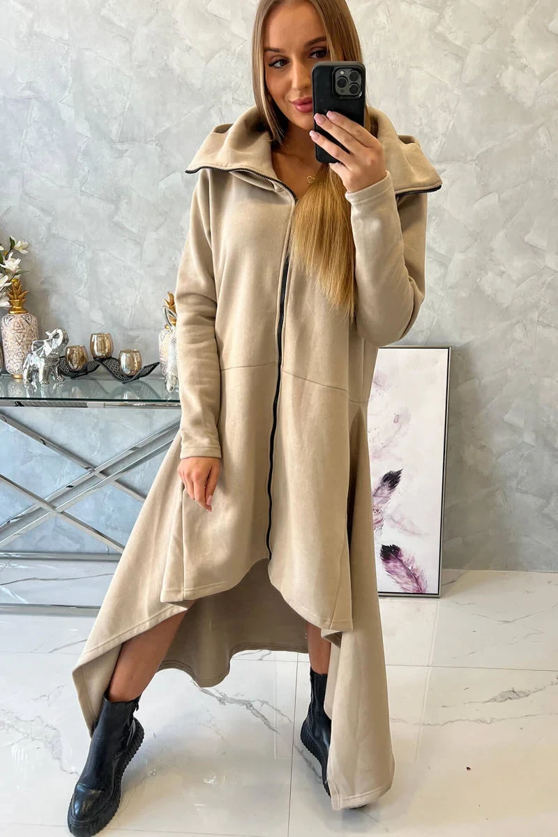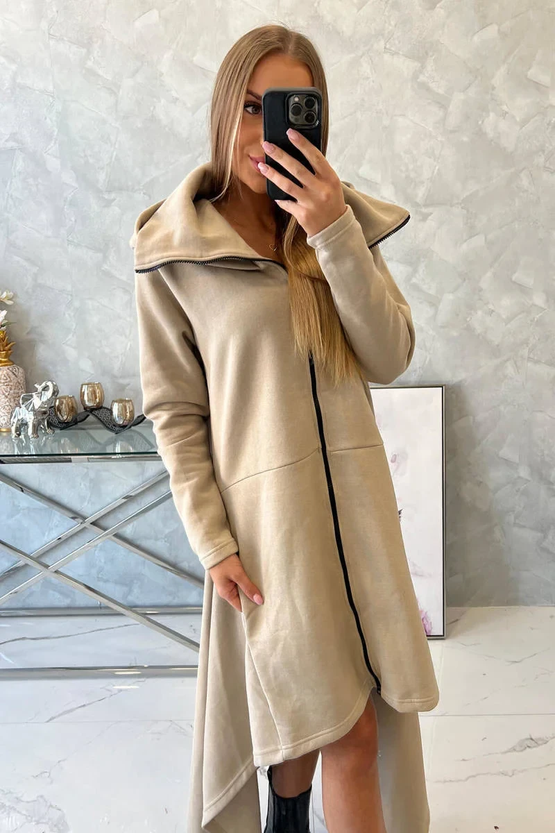 Představujeme vám módní šaty. Šaty mají kapuci, zapínání na zip a delší boky. Ideální každodenní poloha. Šaty jsou vyrobeny z vysoce kvalitní zateplené tkaniny. Velikost je univerzální a vyhovuje dámám, které nosí velikost S, M nebo L.