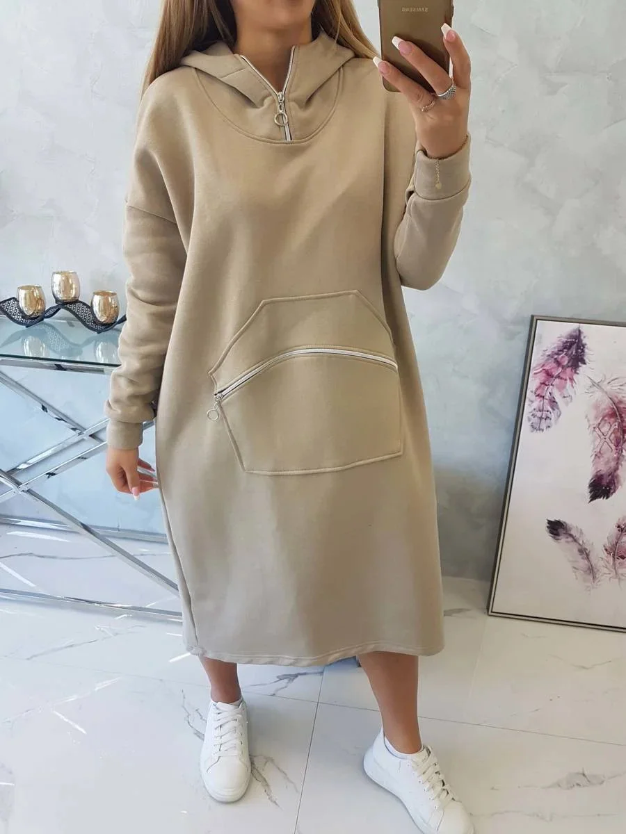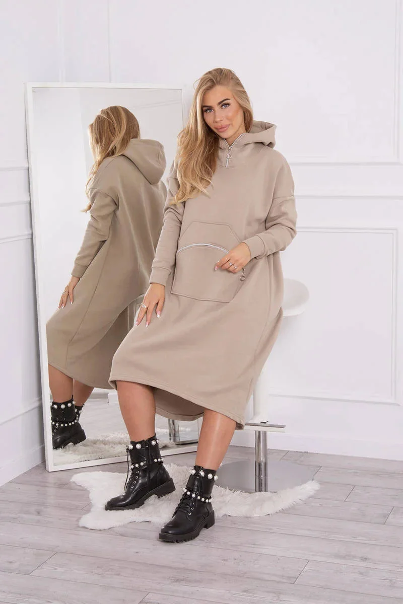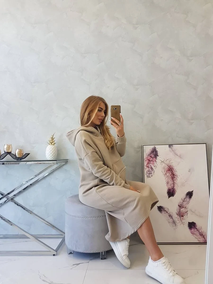Představujeme vám módní šaty. Šaty mají kapuci. Ideální každodenní poloha. Šaty jsou vyrobeny z vysoce kvalitní zateplené tkaniny. Velikost je univerzální a vyhovuje dámám, které nosí velikost S, M nebo L.