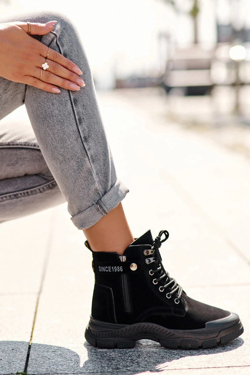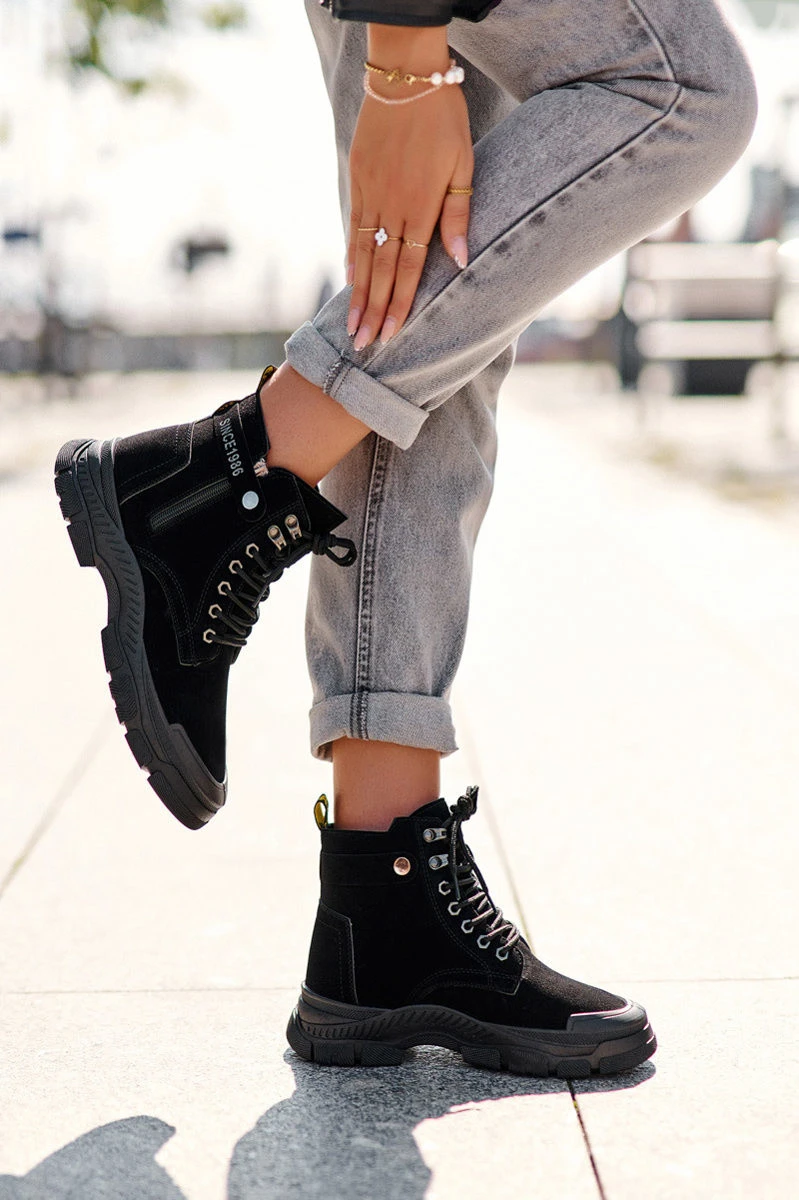 Dámské trapery jsou umístěny na plochém podpatku a platformě. Vyrobeno z eko semiše. Zapíná se na zip po vnější straně kotníku a ještě šněrování. Špička je zesílená, nosky jsou zaoblené. Masivní podešev a plochý podpatek zajišťují stabilitu při používání na nerovném povrchu. Při výběru velikosti se řiďte tabulkou velikostí.