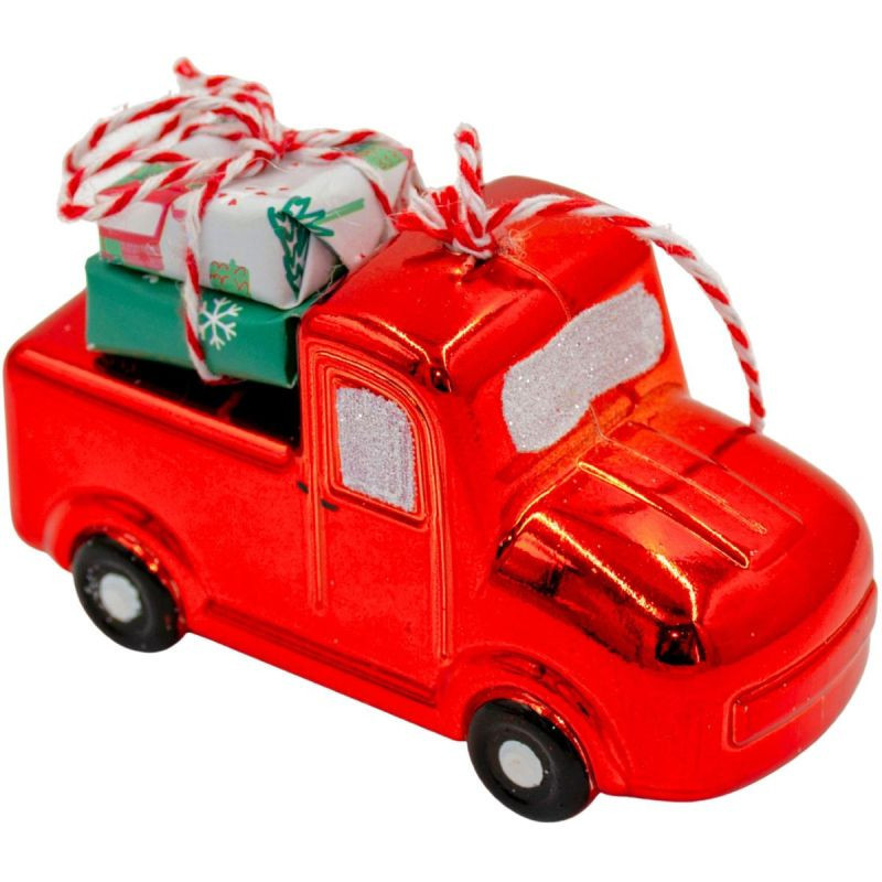 - ozdoba na vánoční stromek ve tvaru červeného auta s dárky