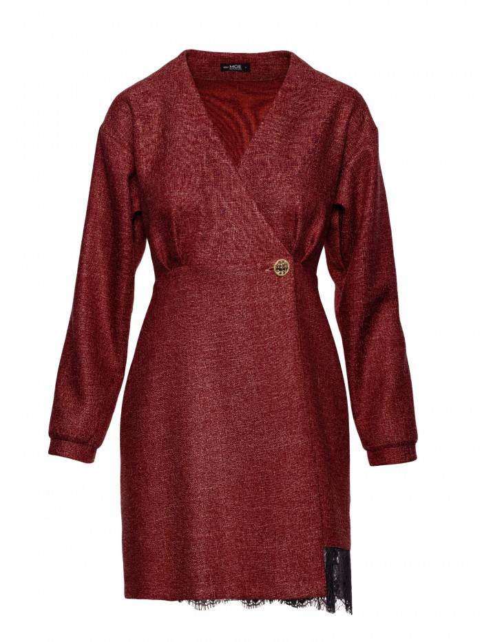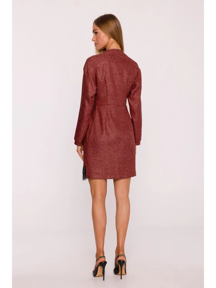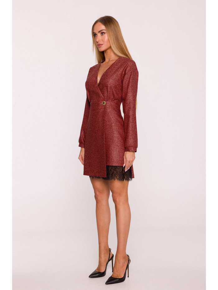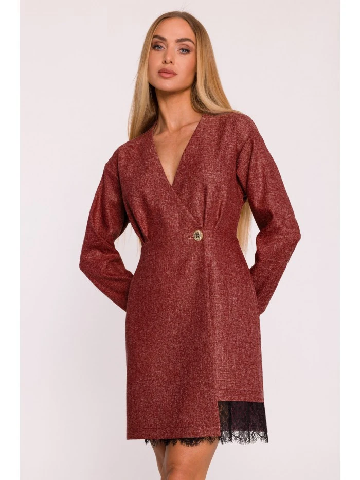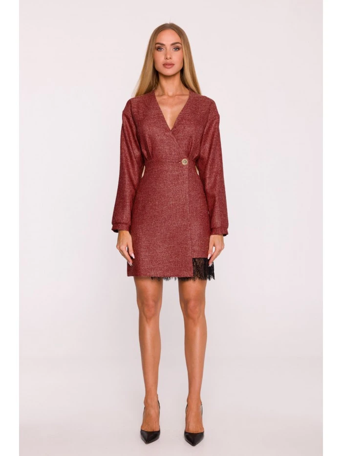 70% polyester 27% rayon 3% spandex MATERIÁL Tkanina: Tweed s krajkovými detaily PODROBNOSTI O PRODUKTU Výstřih: Hluboký výstřih do V Rukávy: Dlouhé Zapínání: Zapíná se na vnitřní skrytý knoflík a vnější ozdobný knoflík Kapsy: Žádné Podšívka: Ne Vzor: Mélange Detaily: Ozdobný zlatý knoflík v pase, krajková vsadka ve spodním lemu Model: M871 Navrženo a vyrobeno v Polsku Modelka na fotografii měří 171 cm a má na sobě velikost S Střih a střih Střih: Lehce přizpůsobený Tvar: Zavinovací přední díl s ohraničeným pasem Délka: Mini