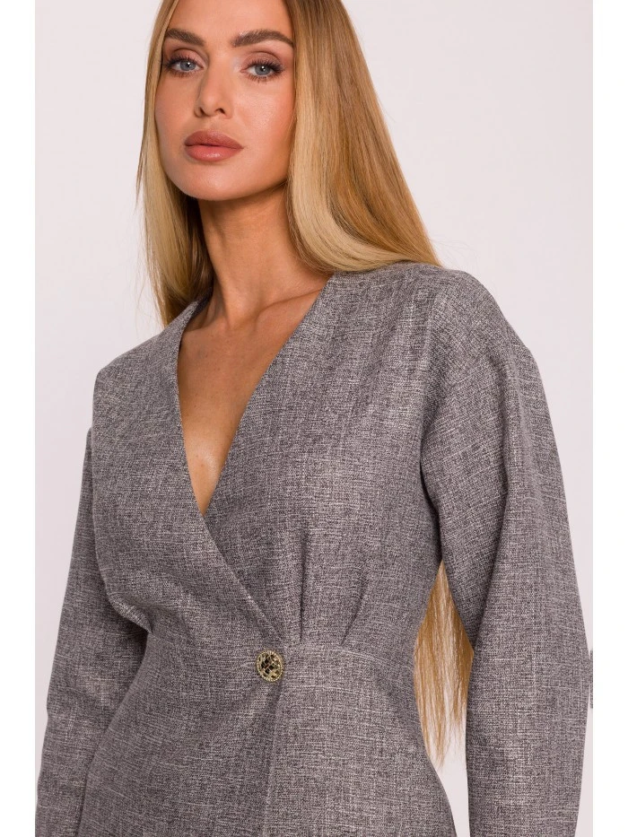 70% polyester 27% rayon 3% spandex MATERIÁL Tkanina: Tweed s krajkovými detaily PODROBNOSTI O PRODUKTU Výstřih: Hluboký výstřih do V Rukávy: Dlouhé Zapínání: Zapíná se na vnitřní skrytý knoflík a vnější ozdobný knoflík Kapsy: Žádné Podšívka: Ne Vzor: Mélange Detaily: Ozdobný zlatý knoflík v pase, krajková vsadka ve spodním lemu Model: M871 Navrženo a vyrobeno v Polsku Modelka na fotografii měří 171 cm a má na sobě velikost S Střih a střih Střih: Lehce přizpůsobený Tvar: Zavinovací přední díl s ohraničeným pasem Délka: Mini
