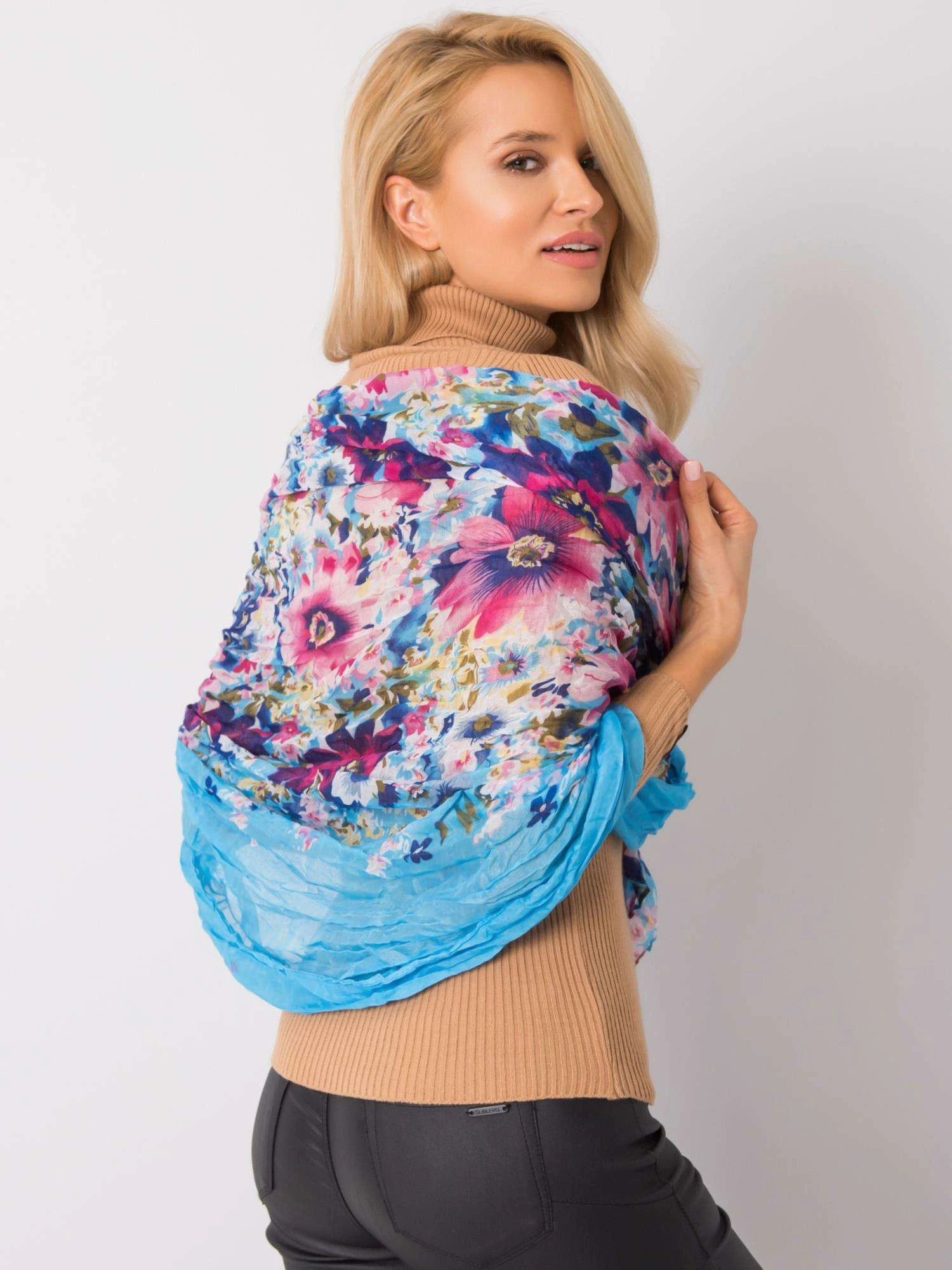 Světle modrá šála s květinovým potiskem.
