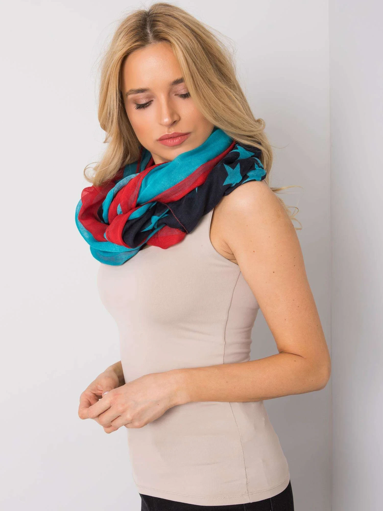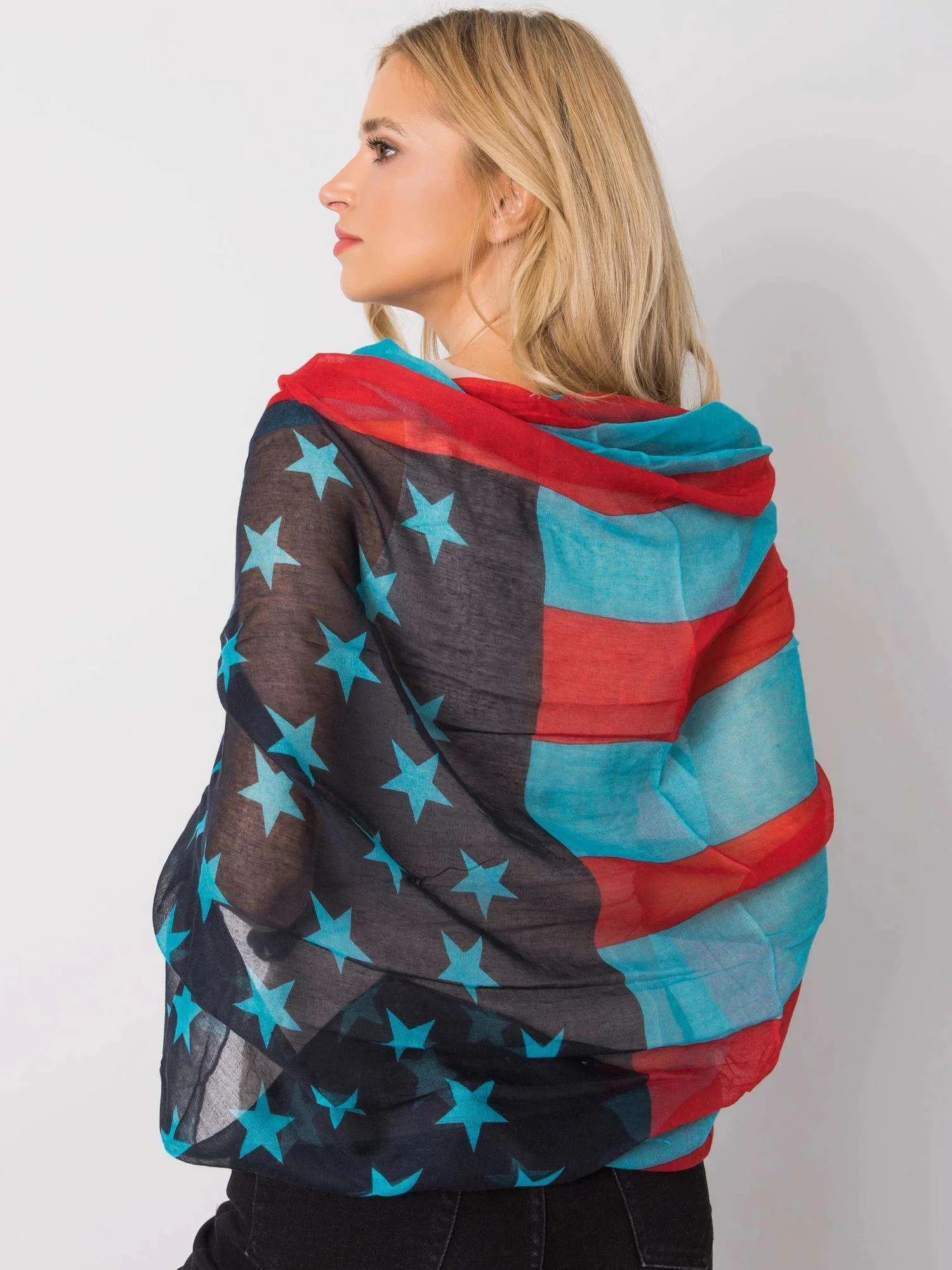 Červená a modrá šála s potiskem.