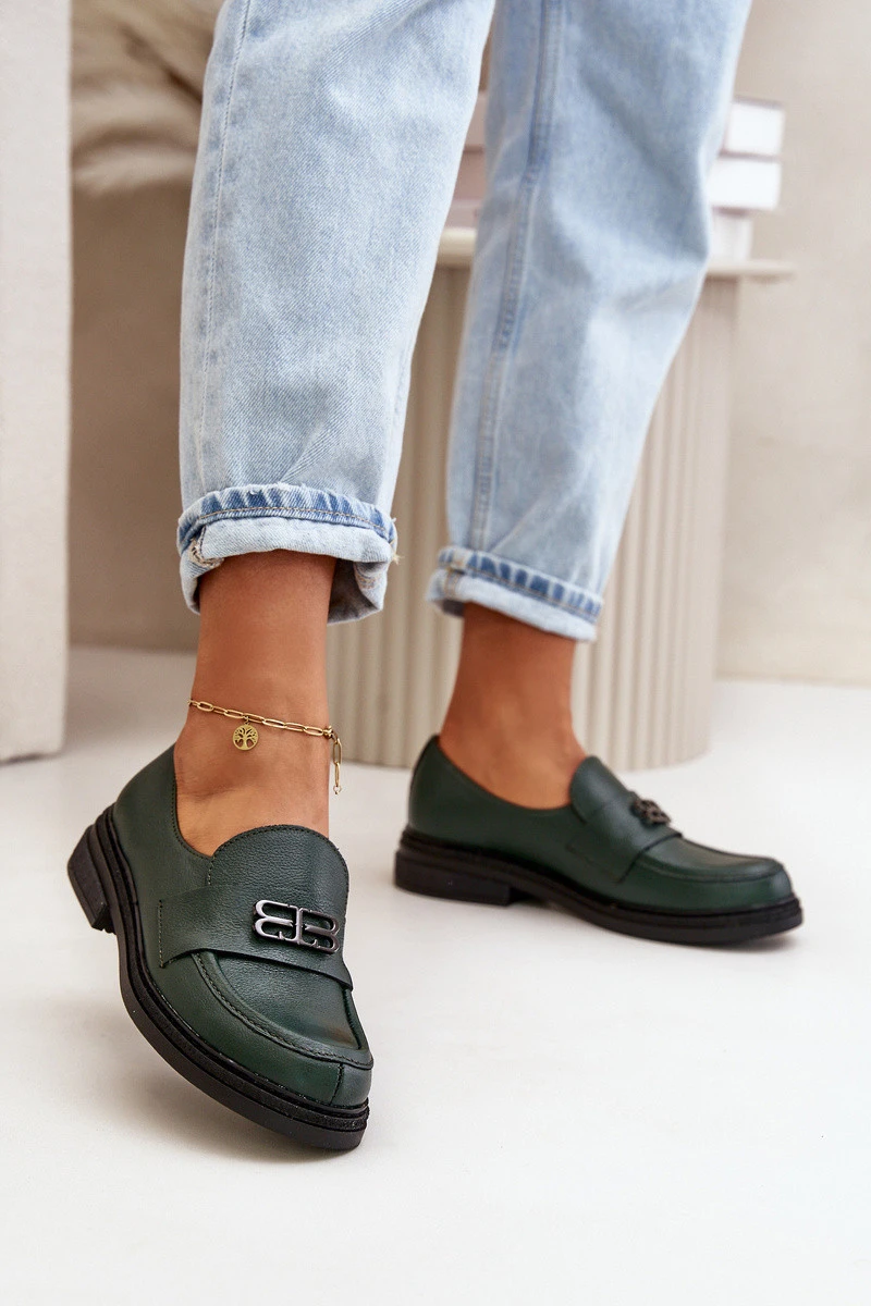 Zazoo 20174 Kožené Elegantní Polobotky Dámské Na Plochém Podpatku Tmavě Zelené