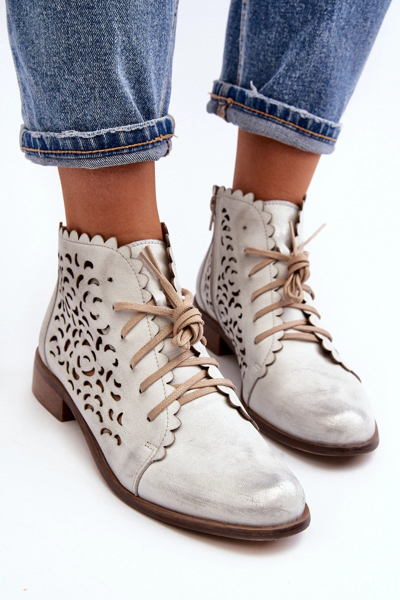 Dámské boty byly vyrobeny z vysoce kvalitní přírodní kůže. Umístěné na ploché podrážce. Holeň nad kotníkem zdobená vzorem. Zakulacené špičky. Vložka z přírodní kůže zajistí pohodlí při nošení. Klasický model se šněrováním. Ideální k kalhotám, sukním a šatům. Určitě byste je měly mít! Při výběru velikosti se řiďte tabulkou velikostí.
