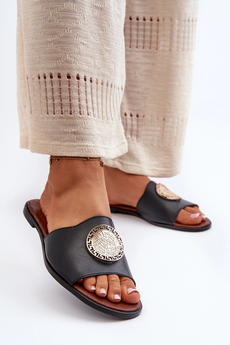 Zazoo 2938 Kožené Žabky Na Ploché Podrážce S Ozdobou Černé