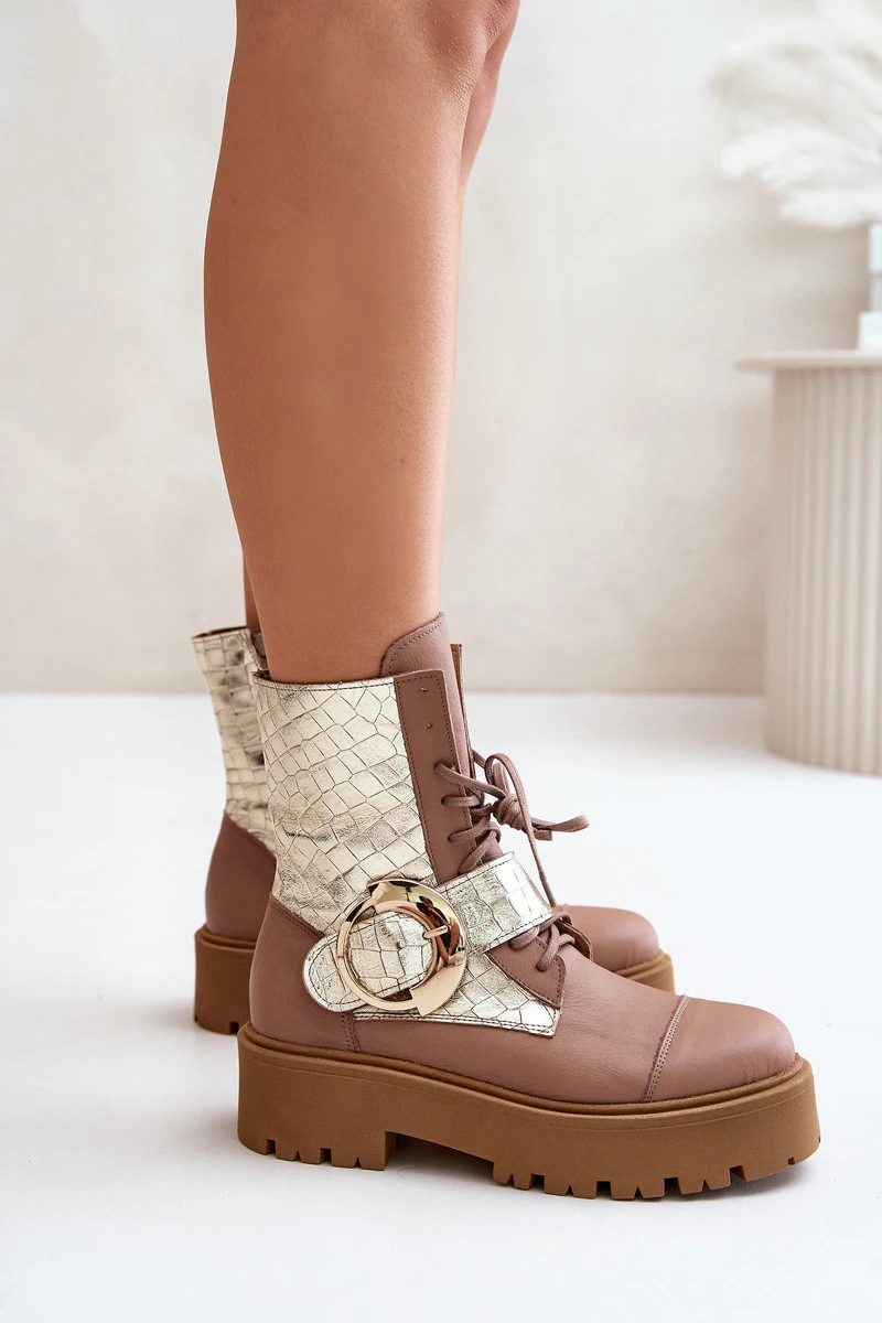 Zazoo 2942 Kožené Boty Worker Se Zlatým Sponou Béžové