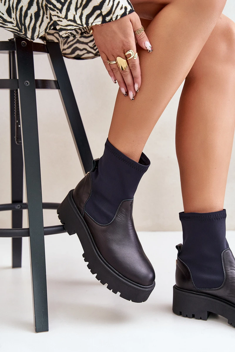 Dámské kozačky s kotníkem. Vyrobené z přírodní kůže. Vsazené na masivní platformě. Model nasunutí. Zakulacené špičky. Tyto boty budou sedět na úzkou nohu. Ideální pro jarní styly! Při výběru velikosti se řiďte tabulkou velikostí.